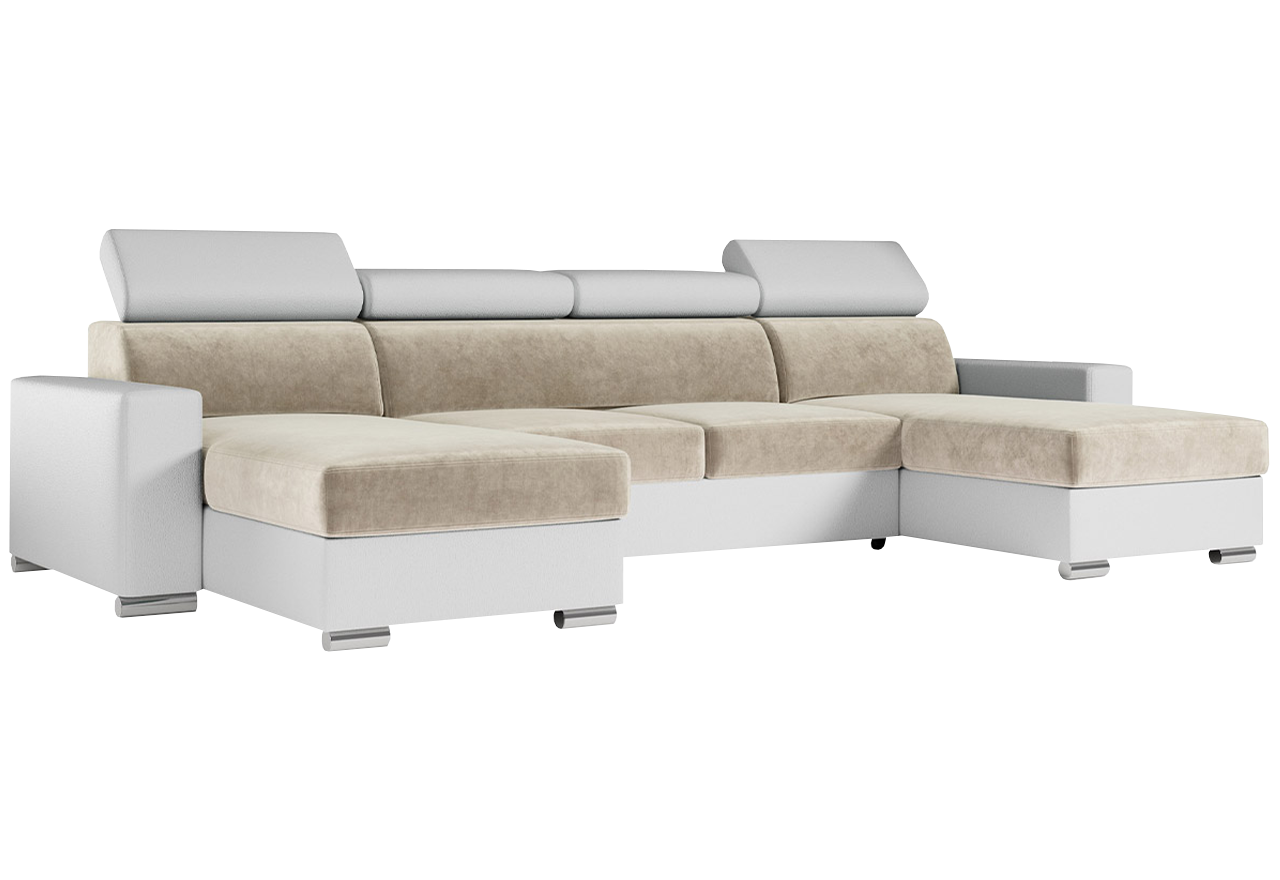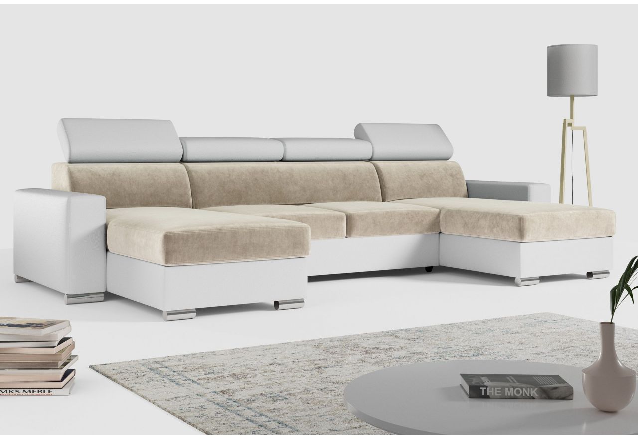 Dwukolorowy, wolnostojący narożnik wypoczynkowy FOX U beżowo-biały, z funkcją spania i regulowanymi zagłówkami
