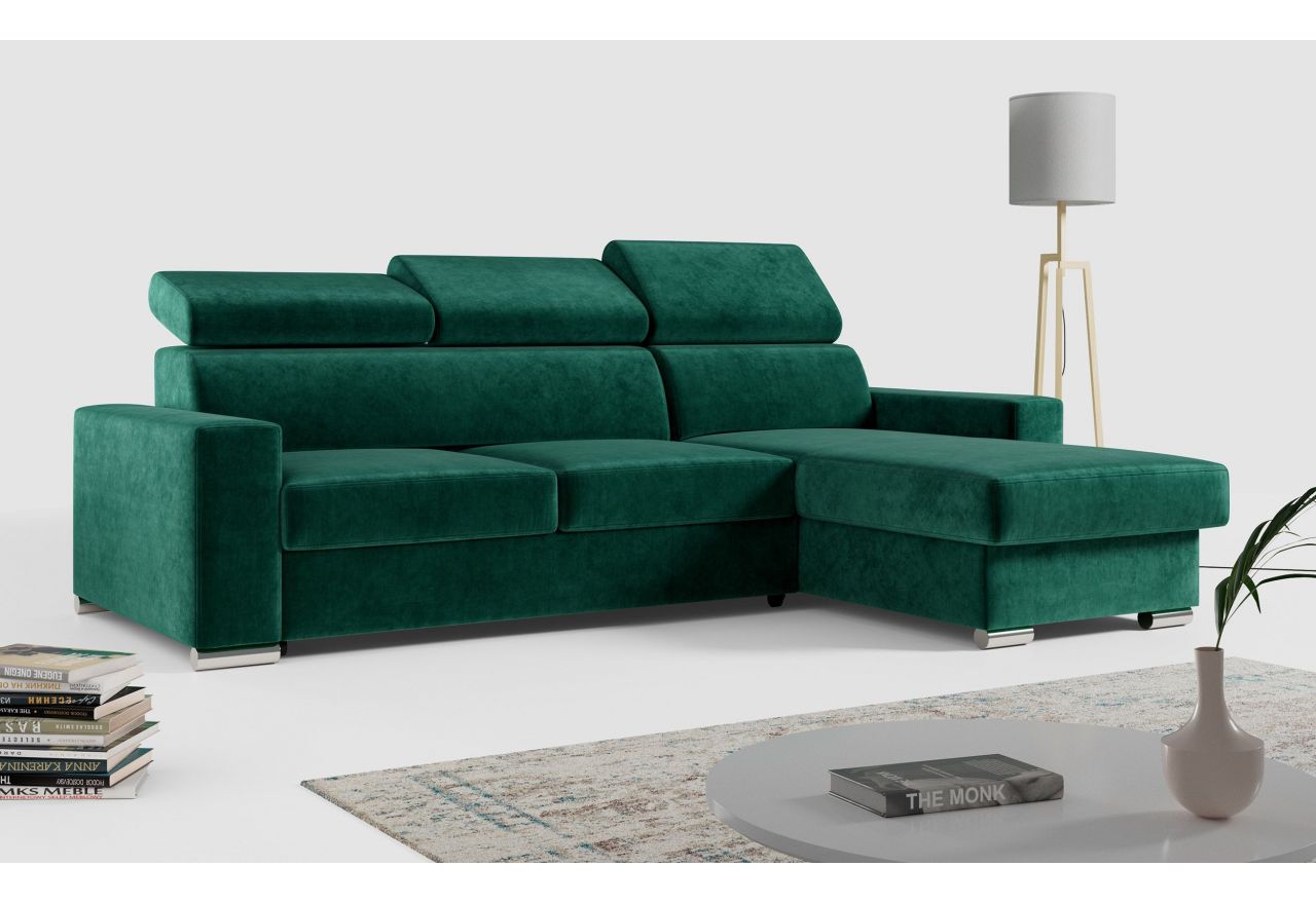 Sprężynowy narożnik rozkładany, z regulowanymi zagłówkami FOX w kolorze butelkowej zieleni