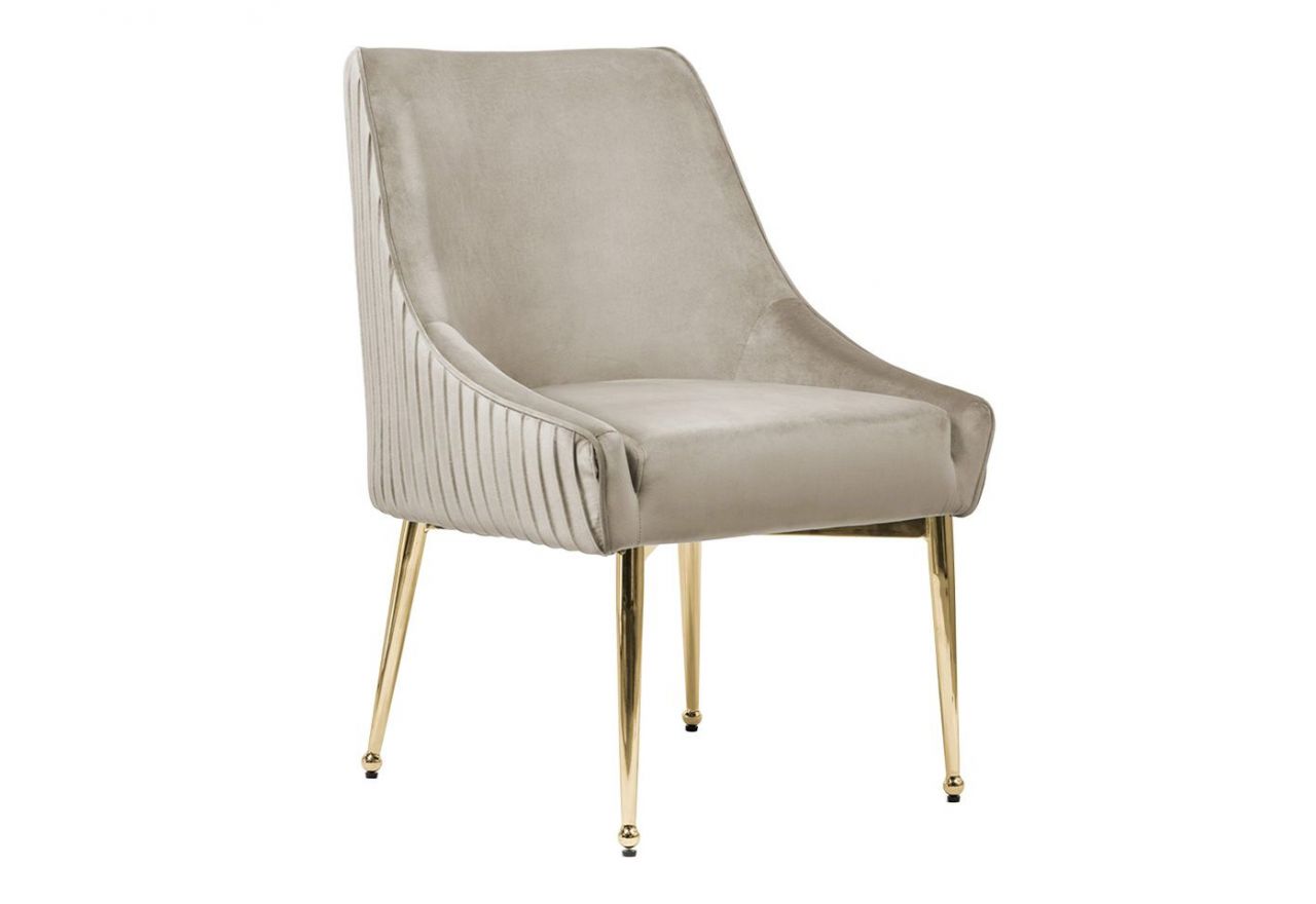 Tapicerowane krzesło NOEL w beżowym kolorze i na smukłych, krzyżakowych, złotych nogach