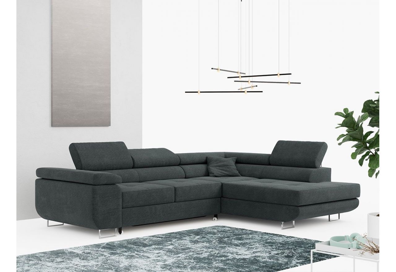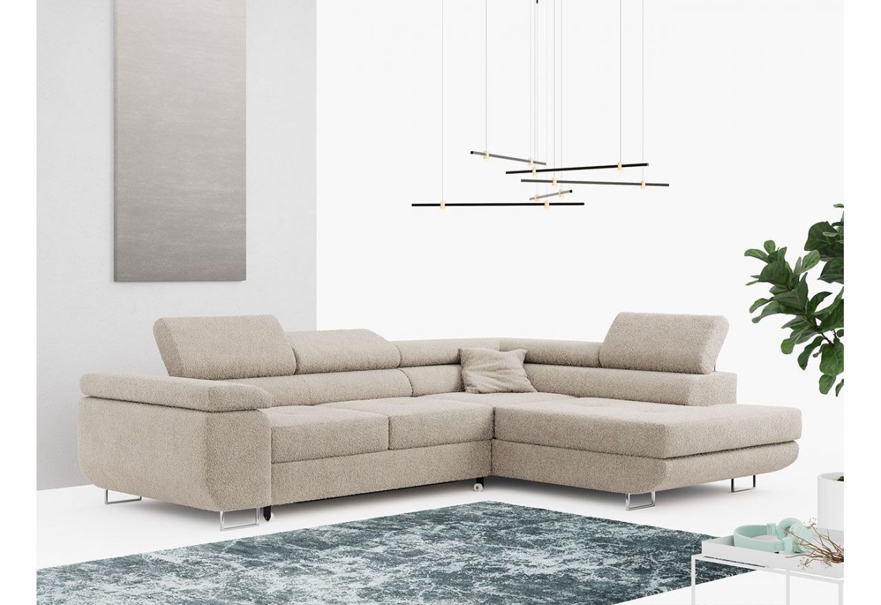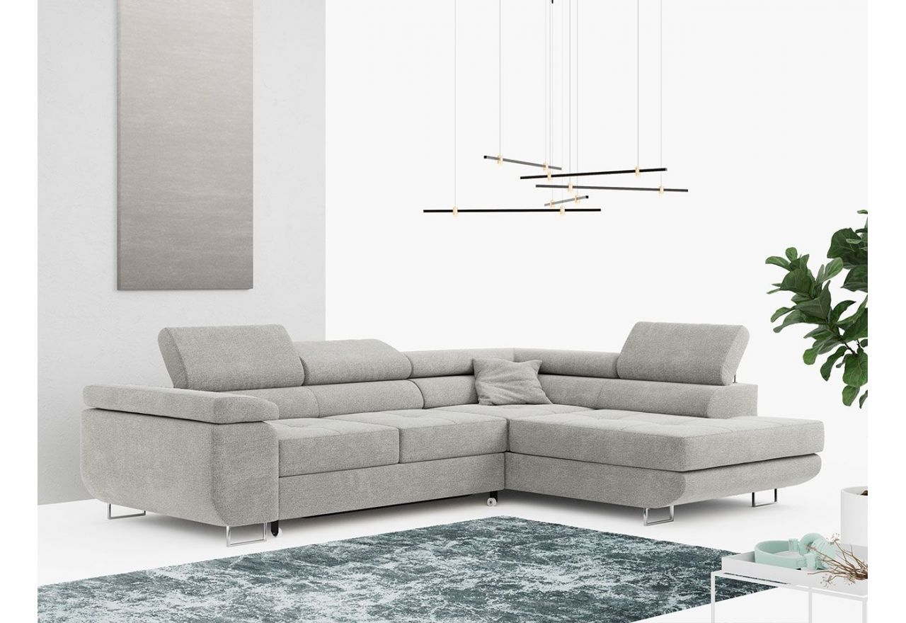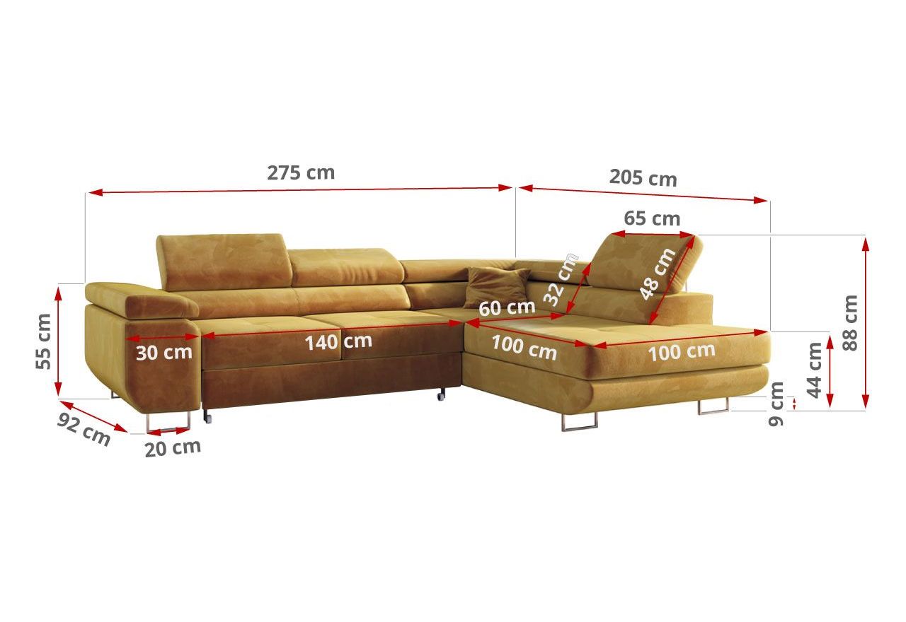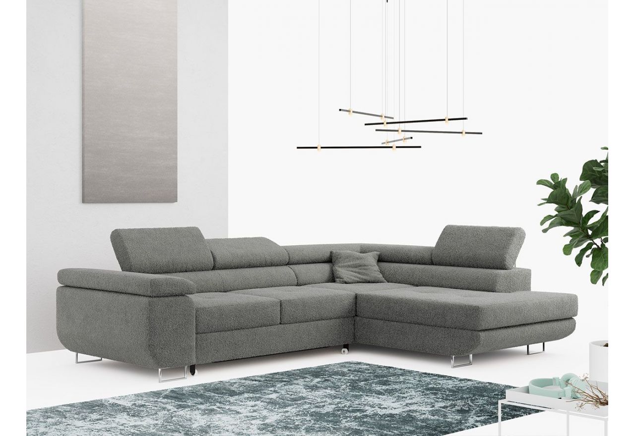 Konstrukcja narożnika opiera się na wysokiej jakości sprężynach oraz trwałej piance wysokoelastycznej T30, co zapewnia komfort użytkowania oraz odpowiednie podparcie. Narożnik posiada funkcję spania, umożliwiając szybkie i wygodne przekształcenie go w łóżko, co czyni go idealnym rozwiązaniem dla gości lub codziennego użytku. Dodatkowym atutem jest praktyczny pojemnik na pościel, który pomaga w utrzymaniu porządku i optymalnym wykorzystaniu przestrzeni. Automat na sprężynach sprawia, że otwieranie pojemnika jest wygodne i szybkie. Dzięki swojej funkcjonalności i estetycznemu designowi, stanowi harmonijne połączenie komfortu i praktyczności.