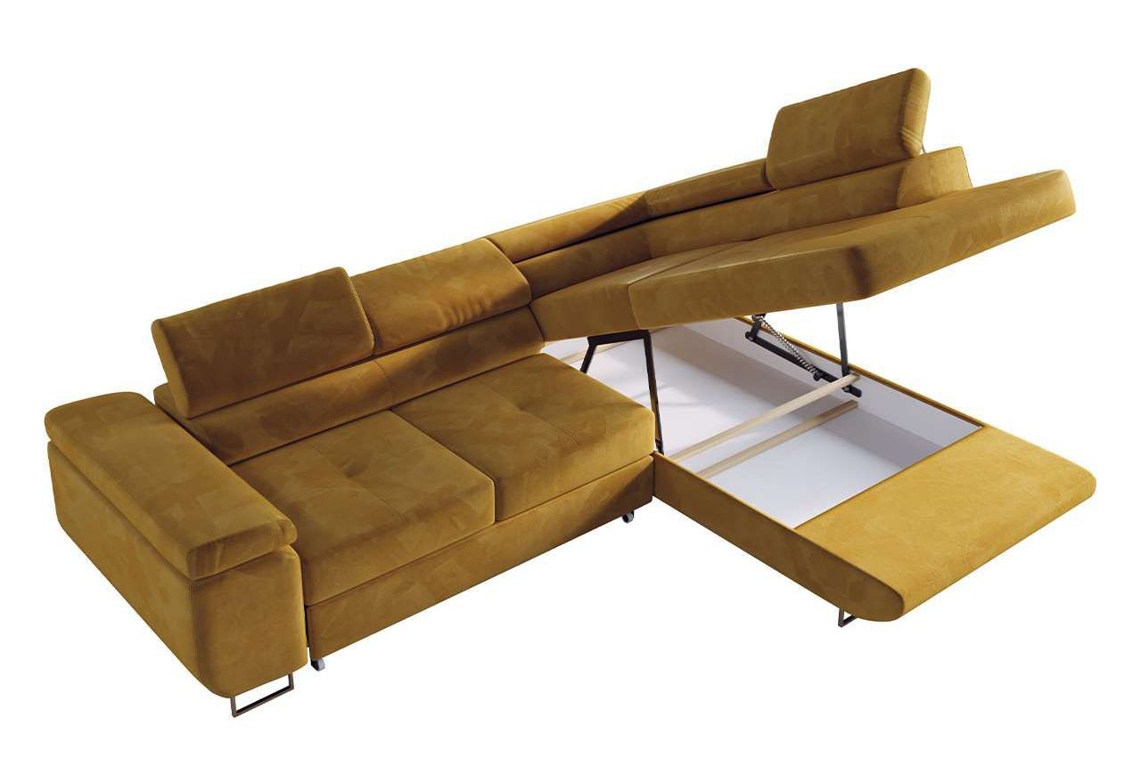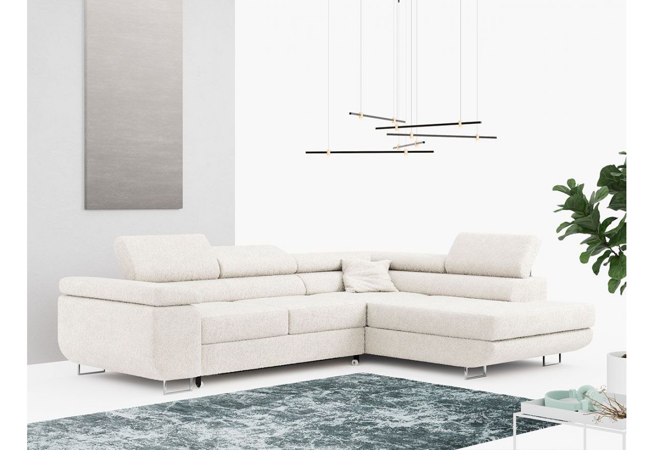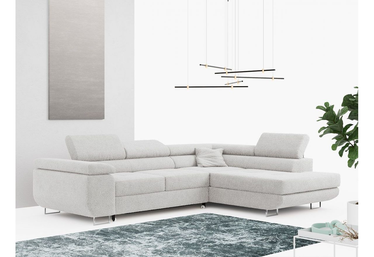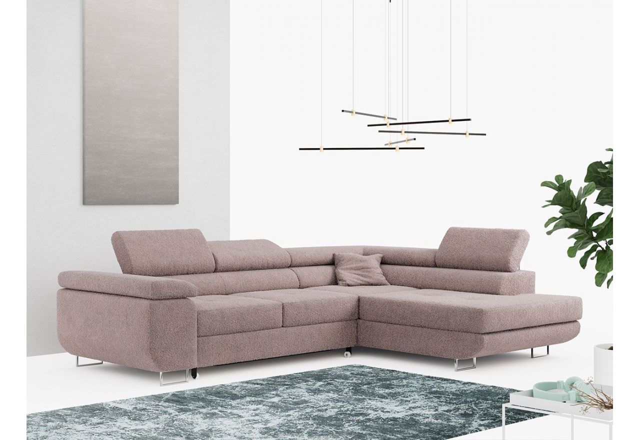 Konstrukcja narożnika opiera się na wysokiej jakości sprężynach oraz trwałej piance wysokoelastycznej T30, co zapewnia komfort użytkowania oraz odpowiednie podparcie. Narożnik posiada funkcję spania, umożliwiając szybkie i wygodne przekształcenie go w łóżko, co czyni go idealnym rozwiązaniem dla gości lub codziennego użytku. Dodatkowym atutem jest praktyczny pojemnik na pościel, który pomaga w utrzymaniu porządku i optymalnym wykorzystaniu przestrzeni. Automat na sprężynach sprawia, że otwieranie pojemnika jest wygodne i szybkie. Dzięki swojej funkcjonalności i estetycznemu designowi, stanowi harmonijne połączenie komfortu i praktyczności.