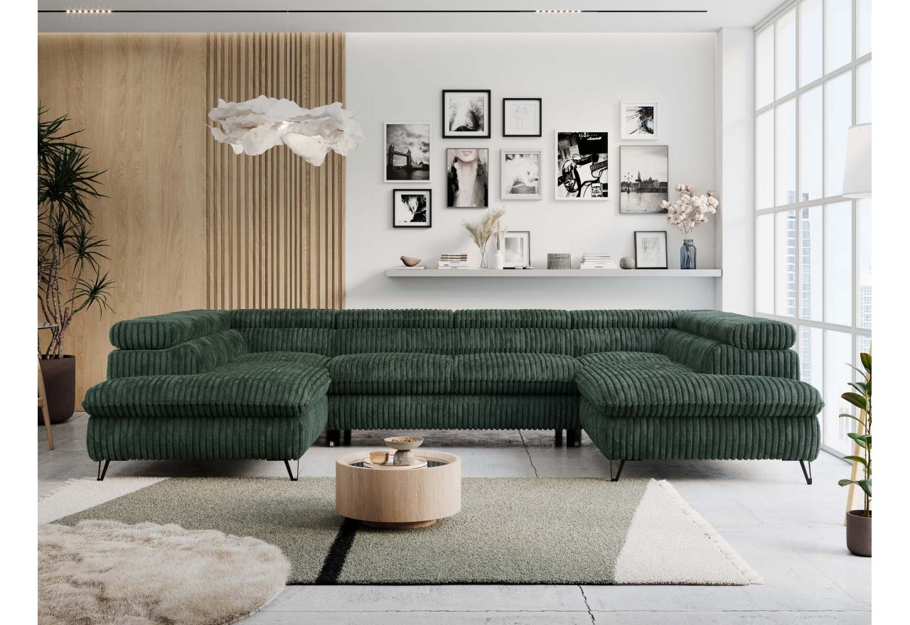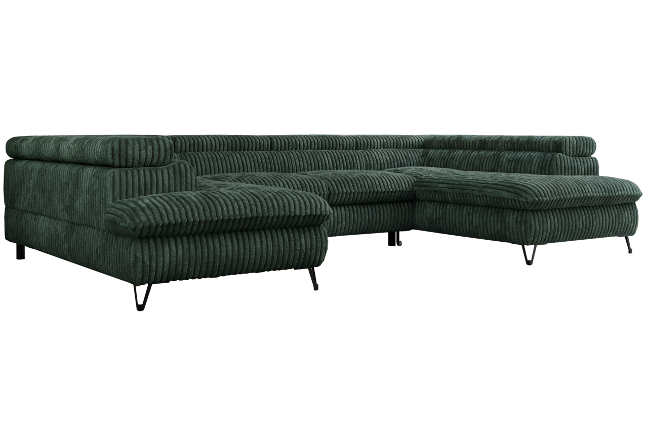 Narożnik do salonu z funkcją spania PETER U, dwoma pojemnikami, czarnymi nóżkami, w zielonym prążkowanym sztruksie - Tilia 39