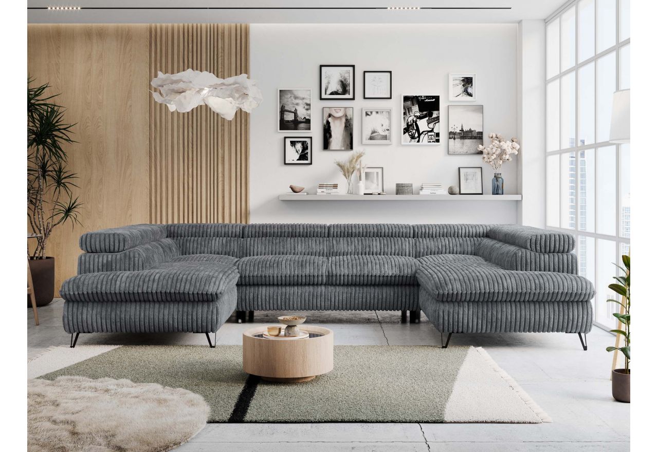 Narożnik U na metalowych, czarnych nóżkach, 6-osobowy PETER U, rozkładany, w ciemnoszarej prążkowanej, sztruksowej tkaninie - Tilia 90