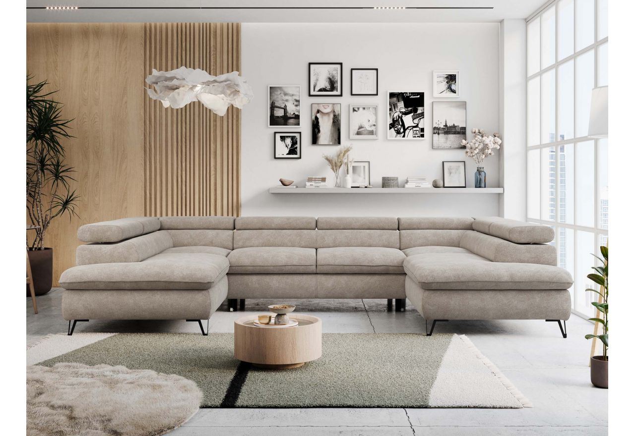 Marzy Ci się elegancki salon z nowoczesnymi meblami? Otwórz drzwi do komfortu i stylu z narożnikiem PETER U. Ten uniwersalny narożnik typu U to esencja funkcjonalności, która odmieni Twoje wnętrze. Wykonany ze sprężyny falistej i pianki wysokoelastycznej HR35/40, narożnik PETER U gwarantuje odpowiednią elastyczność oraz wygodę podczas długotrwałego wypoczynku. Pianka HR charakteryzuje się wysoką elastycznością, amortyzacją i wytrzymałością. Zapewnia lepszą cyrkulację powietrza niż tradycyjna pianka poliuretanowa oraz szybciej powraca do pierwotnego kształtu. Zapewnia wysoki komfort użytkowania, dzięki lepszemu dopasowaniu się do kształtu ciała. Pianka wysokoelastyczna nie pochłania kurzu - jest idealna dla alergików. W zestawie narożnika znajduje się również materac nawierzchniowy standardowy, który zapewnia dodatkowy komfort podczas spania. Dodatkowo, regulowane zagłówki pozwalają na dostosowanie pozycji do indywidualnych preferencji. Narożnik PETER U wyposażony jest w innowacyjny automat Delfin, który wspomaga rozkładanie do funkcji spania, zapewniając wygodę Twoim gościom. Zastosowanie dwóch pojemników na pościel zapewnia praktyczne miejsce do przechowywania, zachowując jednocześnie porządek w Twoim salonie. Wolnostojąca konstrukcja oraz metalowe czarne nóżki gwarantują stabilność i swobodę w aranżacji przestrzeni. Zaadoptuj narożnik PETER U do swojego stylu życia i ciesz się komfortem na najwyższym poziomie każdego dnia.