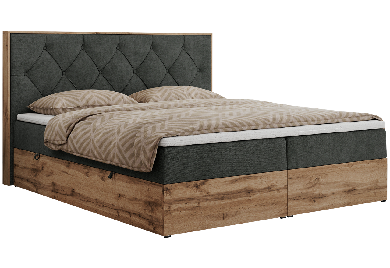 Główny materac kieszeniowy Multipocket dostarcza doskonałego wsparcia dla ciała, dzięki wysokoelastycznej piance T-30 co jest kluczowe dla zdrowego snu. Jego konstrukcja z niezależnymi kieszeniami minimalizuje przenoszenie ruchu. Dodatkowo, materac nawierzchniowy wykończony pianką T-25 zapewnia uczucie miękkości i komfortu, dostosowując się do kształtu ciała. Dwa pojemniki na pościel to praktyczne rozwiązanie, które pozwoli na łatwe przechowywanie pościeli i utrzymanie porządku. Automat na sprężynach sprawia, że otwieranie pojemników jest wygodne i szybkie. Łóżko kontynentalne posiada drewniane wykończenie na skrzyni oraz ramie wezgłowia. Dodaje wnętrzu ciepła i stylu, a nowoczesny design sprawia, że idealnie wpisuje się w różnorodne aranżacje.