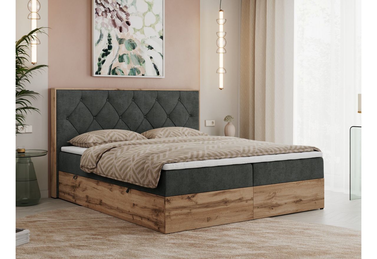 Główny materac kieszeniowy Multipocket dostarcza doskonałego wsparcia dla ciała, dzięki wysokoelastycznej piance T-30 co jest kluczowe dla zdrowego snu. Jego konstrukcja z niezależnymi kieszeniami minimalizuje przenoszenie ruchu. Dodatkowo, materac nawierzchniowy wykończony pianką T-25 zapewnia uczucie miękkości i komfortu, dostosowując się do kształtu ciała. Dwa pojemniki na pościel to praktyczne rozwiązanie, które pozwoli na łatwe przechowywanie pościeli i utrzymanie porządku. Automat na sprężynach sprawia, że otwieranie pojemników jest wygodne i szybkie. Łóżko kontynentalne posiada drewniane wykończenie na skrzyni oraz ramie wezgłowia. Dodaje wnętrzu ciepła i stylu, a nowoczesny design sprawia, że idealnie wpisuje się w różnorodne aranżacje.