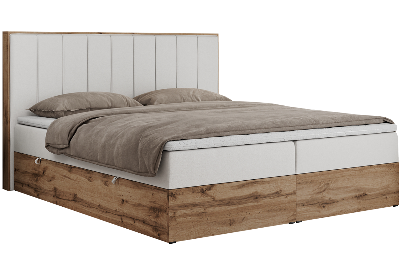 Główny materac kieszeniowy Multipocket dostarcza doskonałego wsparcia dla ciała, dzięki wysokoelastycznej piance T-30 co jest kluczowe dla zdrowego snu. Jego konstrukcja z niezależnymi kieszeniami minimalizuje przenoszenie ruchu. Dodatkowo, materac nawierzchniowy wykończony pianką T-25 zapewnia uczucie miękkości i komfortu, dostosowując się do kształtu ciała. Dwa pojemniki na pościel to praktyczne rozwiązanie, które pozwoli na łatwe przechowywanie pościeli i utrzymanie porządku. Automat na sprężynach sprawia, że otwieranie pojemników jest wygodne i szybkie. Łóżko kontynentalne posiada drewniane wykończenie na skrzyni oraz ramie wezgłowia. Dodaje wnętrzu ciepła i stylu, a nowoczesny design sprawia, że idealnie wpisuje się w różnorodne aranżacje.