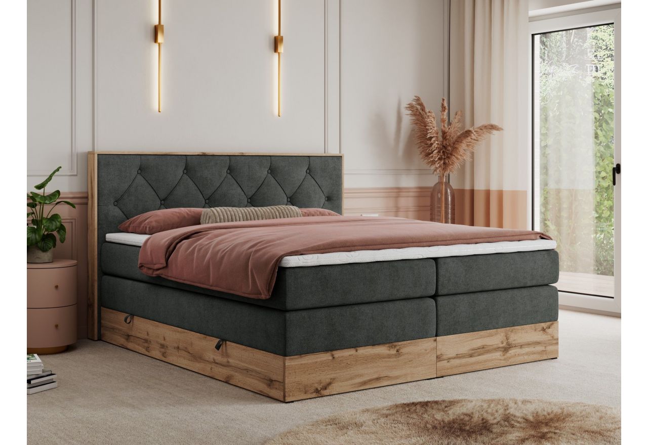 Główny materac kieszeniowy Multipocket dostarcza doskonałego wsparcia dla ciała, dzięki wysokoelastycznej piance T-30 co jest kluczowe dla zdrowego snu. Jego konstrukcja z niezależnymi kieszeniami minimalizuje przenoszenie ruchu. Dodatkowo, materac nawierzchniowy wykończony pianką T-25 zapewnia uczucie miękkości i komfortu, dostosowując się do kształtu ciała. Dwa pojemniki na pościel to praktyczne rozwiązanie, które pozwoli na łatwe przechowywanie pościeli i utrzymanie porządku. Automat na sprężynach sprawia, że otwieranie pojemników jest wygodne i szybkie. Łóżko kontynentalne posiada drewniane wykończenie na skrzyni oraz ramie wezgłowia. Dodaje wnętrzu ciepła i stylu, a nowoczesny design sprawia, że idealnie wpisuje się w różnorodne aranżacje.