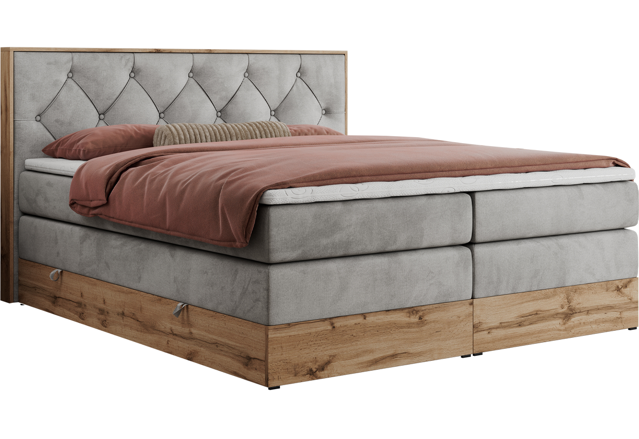 Główny materac kieszeniowy Multipocket dostarcza doskonałego wsparcia dla ciała, dzięki wysokoelastycznej piance T-30 co jest kluczowe dla zdrowego snu. Jego konstrukcja z niezależnymi kieszeniami minimalizuje przenoszenie ruchu. Dodatkowo, materac nawierzchniowy wykończony pianką T-25 zapewnia uczucie miękkości i komfortu, dostosowując się do kształtu ciała. Dwa pojemniki na pościel to praktyczne rozwiązanie, które pozwoli na łatwe przechowywanie pościeli i utrzymanie porządku. Automat na sprężynach sprawia, że otwieranie pojemników jest wygodne i szybkie. Łóżko kontynentalne posiada drewniane wykończenie na skrzyni oraz ramie wezgłowia. Dodaje wnętrzu ciepła i stylu, a nowoczesny design sprawia, że idealnie wpisuje się w różnorodne aranżacje.