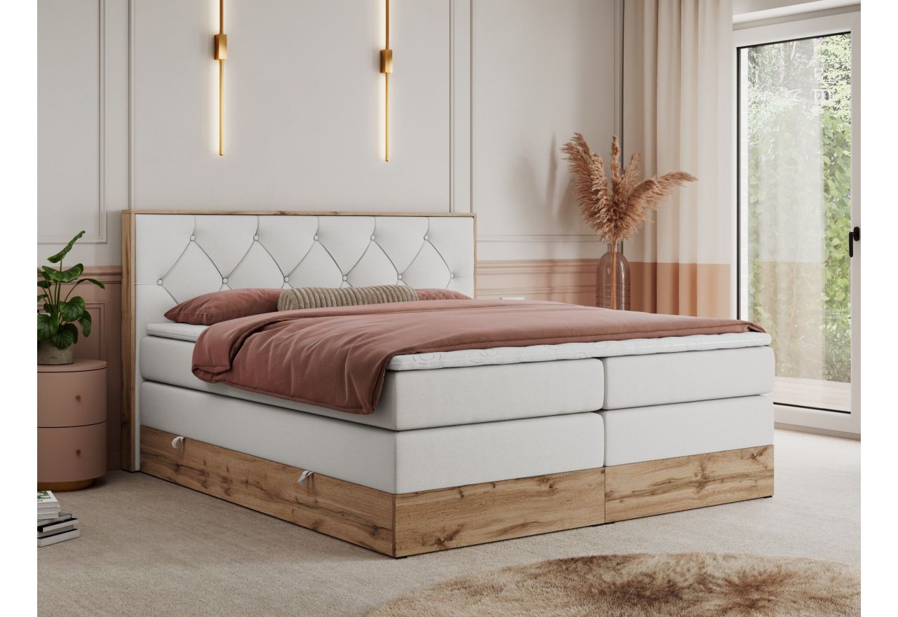 Główny materac kieszeniowy Multipocket dostarcza doskonałego wsparcia dla ciała, dzięki wysokoelastycznej piance T-30 co jest kluczowe dla zdrowego snu. Jego konstrukcja z niezależnymi kieszeniami minimalizuje przenoszenie ruchu. Dodatkowo, materac nawierzchniowy wykończony pianką T-25 zapewnia uczucie miękkości i komfortu, dostosowując się do kształtu ciała. Dwa pojemniki na pościel to praktyczne rozwiązanie, które pozwoli na łatwe przechowywanie pościeli i utrzymanie porządku. Automat na sprężynach sprawia, że otwieranie pojemników jest wygodne i szybkie. Łóżko kontynentalne posiada drewniane wykończenie na skrzyni oraz ramie wezgłowia. Dodaje wnętrzu ciepła i stylu, a nowoczesny design sprawia, że idealnie wpisuje się w różnorodne aranżacje.
