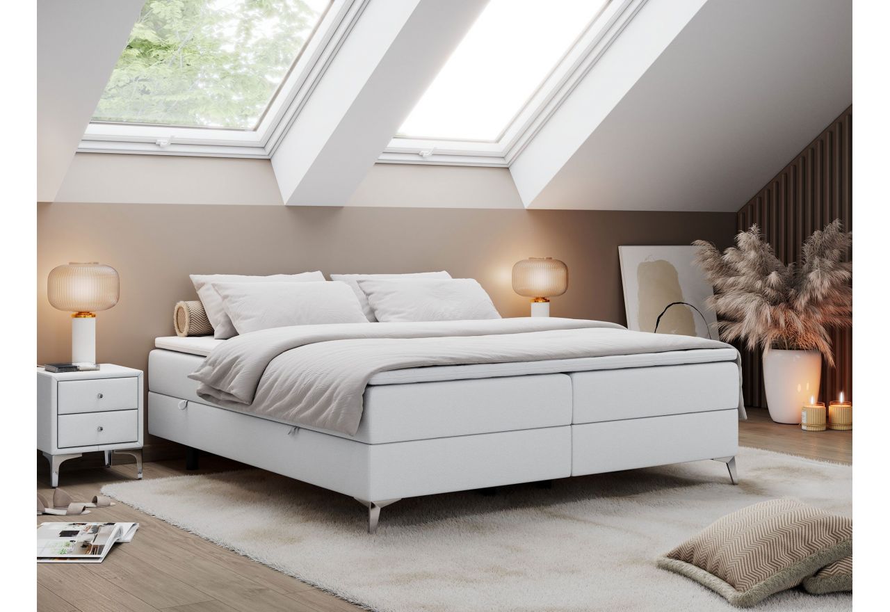 Główny materac kieszeniowy Multipocket dostarcza doskonałego wsparcia dla ciała, dzięki wysokoelastycznej piance T-30 co jest kluczowe dla zdrowego snu. Jego konstrukcja z niezależnymi kieszeniami minimalizuje przenoszenie ruchu. Dodatkowo, materac nawierzchniowy wykończony pianką T-25 zapewnia uczucie miękkości i komfortu, dostosowując się do kształtu ciała. Dwa pojemniki na pościel to praktyczne rozwiązanie, które pozwoli na łatwe przechowywanie pościeli i utrzymanie porządku. Automat na sprężynach sprawia, że otwieranie pojemników jest wygodne i szybkie. Łóżko nie posiada wezgłowia.