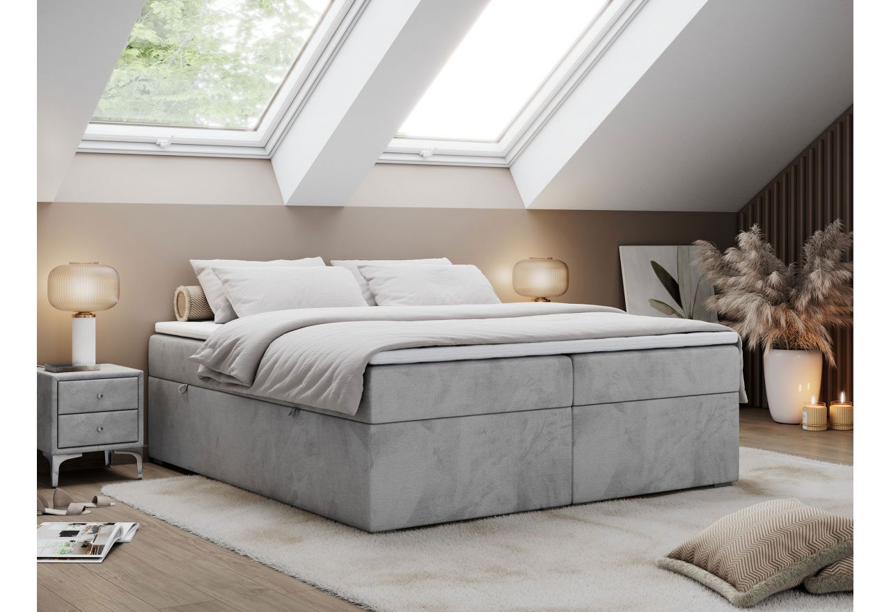 Główny materac kieszeniowy Multipocket dostarcza doskonałego wsparcia dla ciała, dzięki wysokoelastycznej piance T-30 co jest kluczowe dla zdrowego snu. Jego konstrukcja z niezależnymi kieszeniami minimalizuje przenoszenie ruchu. Dodatkowo, materac nawierzchniowy wykończony pianką T-25 zapewnia uczucie miękkości i komfortu, dostosowując się do kształtu ciała. Dwa pojemniki na pościel to praktyczne rozwiązanie, które pozwoli na łatwe przechowywanie pościeli i utrzymanie porządku. Automat na sprężynach sprawia, że otwieranie pojemników jest wygodne i szybkie. Łóżko nie posiada wezgłowia.