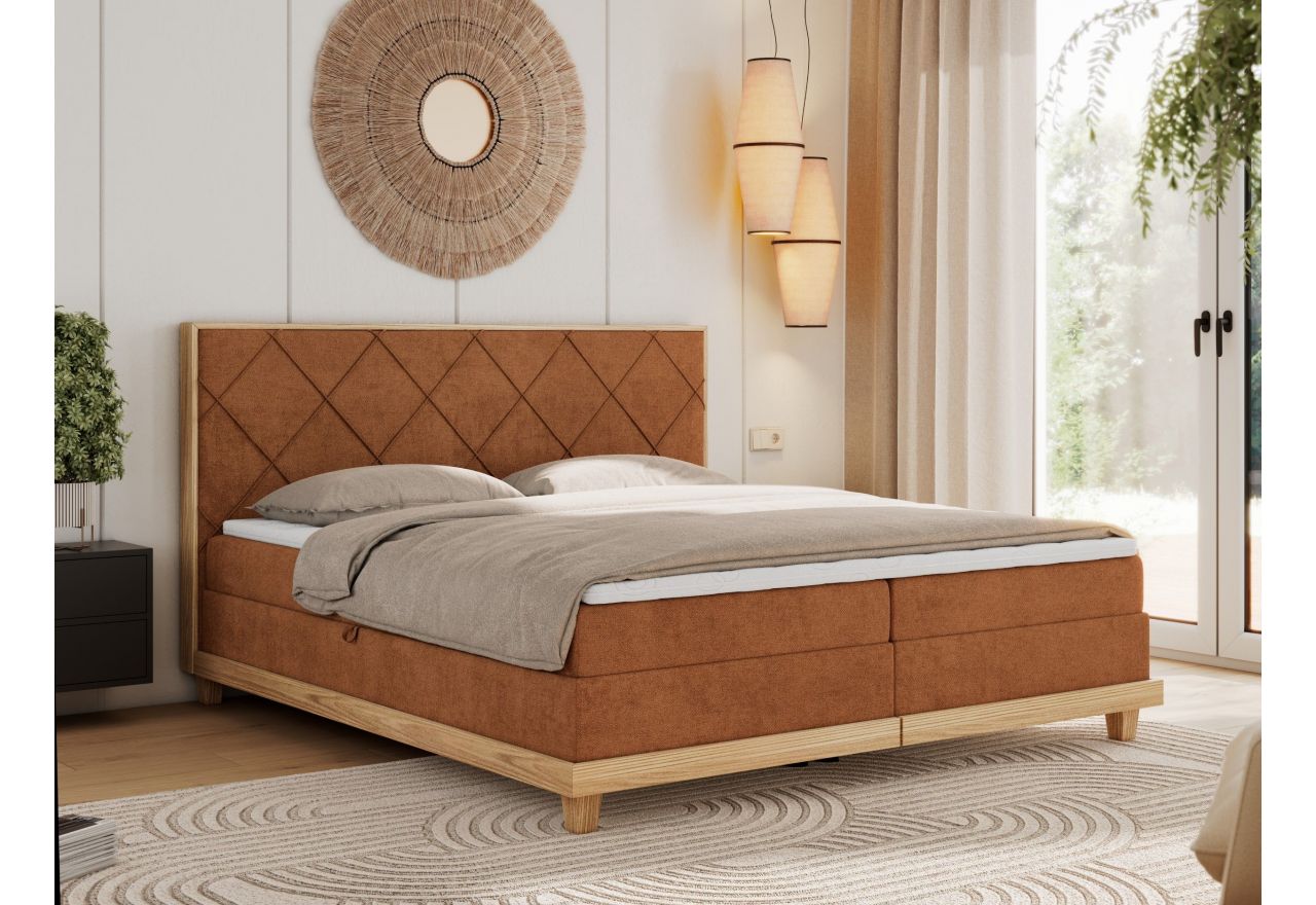 Główny materac kieszeniowy Multipocket dostarcza doskonałego wsparcia dla ciała, dzięki wysokoelastycznej piance T-30 co jest kluczowe dla zdrowego snu. Jego konstrukcja z niezależnymi kieszeniami minimalizuje przenoszenie ruchu. Dodatkowo, materac nawierzchniowy wykończony pianką T-25 zapewnia uczucie miękkości i komfortu, dostosowując się do kształtu ciała. Dwa pojemniki na pościel to praktyczne rozwiązanie, które pozwoli na łatwe przechowywanie pościeli i utrzymanie porządku. Automat na sprężynach sprawia, że otwieranie pojemników jest wygodne i szybkie. Tapicerowany zagłówek to prawdziwa ozdoba, która dodaje wnętrzu klasy i staje się centralnym punktem każdej sypialni. Łóżko kontynentalne posiada drewniane wykończenie na skrzyni oraz ramie wezgłowia. Dodaje wnętrzu ciepła i stylu, a nowoczesny design sprawia, że idealnie wpisuje się w różnorodne aranżacje.