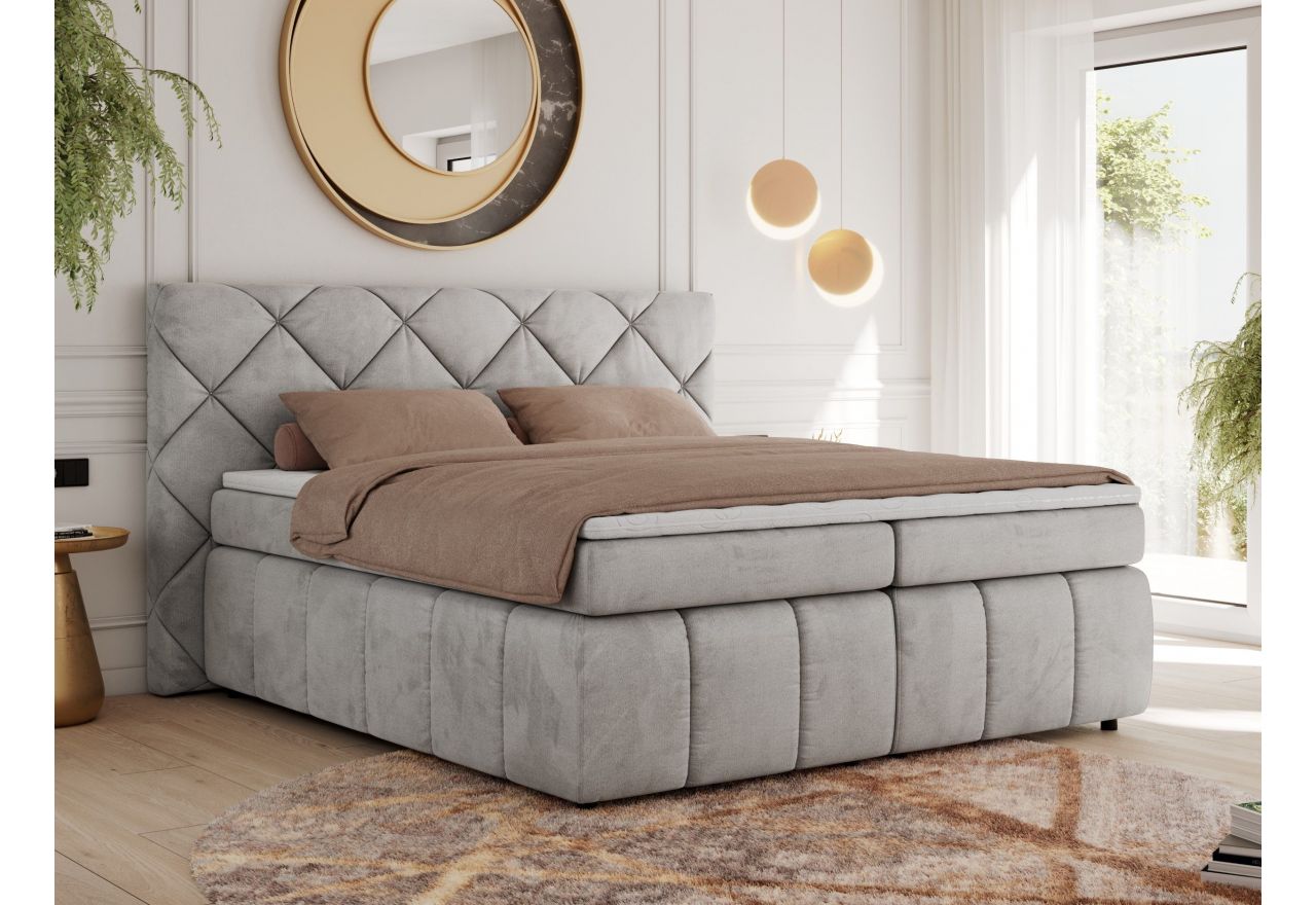 Główny materac kieszeniowy Multipocket dostarcza doskonałego wsparcia dla ciała, dzięki wysokoelastycznej piance T-30 co jest kluczowe dla zdrowego snu. Jego konstrukcja z niezależnymi kieszeniami minimalizuje przenoszenie ruchu. Dodatkowo, materac nawierzchniowy wykończony pianką T-25 zapewnia uczucie miękkości i komfortu, dostosowując się do kształtu ciała. Choć łóżko kontynentalne nie oferuje pojemników na pościel, postawiono na maksymalny komfort i luksusowy design. Głęboko tapicerowany zagłówek to prawdziwa ozdoba, która dodaje wnętrzu klasy i staje się centralnym punktem każdej sypialni.