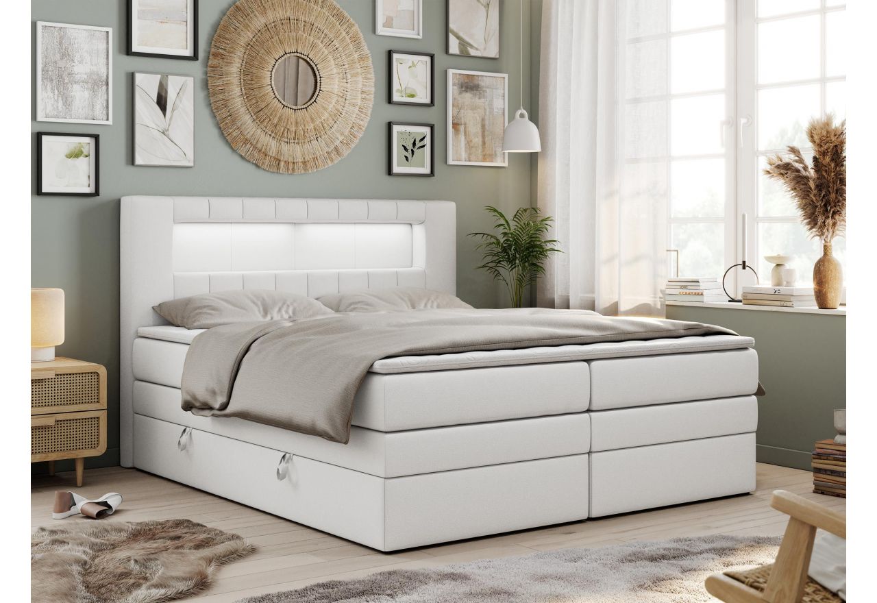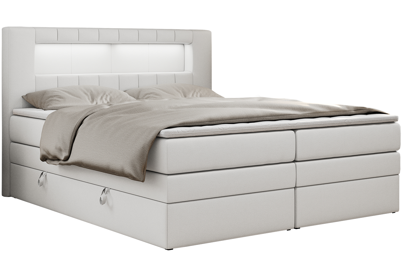 Główny materac kieszeniowy Multipocket dostarcza doskonałego wsparcia dla ciała, dzięki wysokoelastycznej piance T-30 co jest kluczowe dla zdrowego snu. Jego konstrukcja z niezależnymi kieszeniami minimalizuje przenoszenie ruchu. Dodatkowo, materac nawierzchniowy wykończony pianką T-25 zapewnia uczucie miękkości i komfortu, dostosowując się do kształtu ciała. Łóżko wyposażone w 2 poziomy materacy to rozwiązanie podnoszące znacząco komfort snu. Dwa pojemniki na pościel to praktyczne rozwiązanie, które pozwoli na łatwe przechowywanie pościeli i utrzymanie porządku. Automat na podnośnikach gazowych sprawia, że otwieranie pojemników jest wygodne i szybkie. Tapicerowany zagłówek to prawdziwa ozdoba, która dodaje wnętrzu klasy i staje się centralnym punktem każdej sypialni. W wezgłowiu znajduje się praktyczna wnęka z oświetleniem LED.