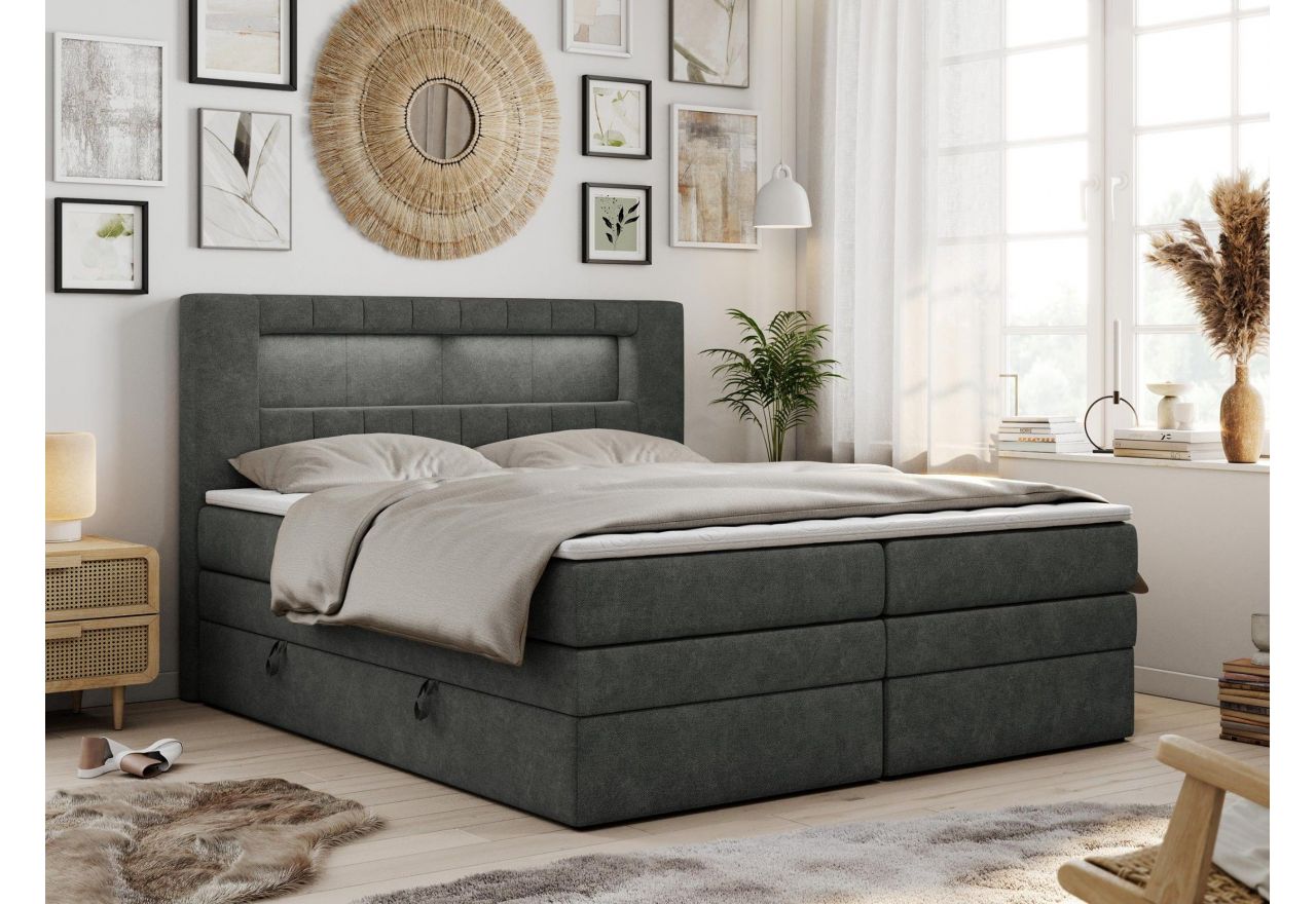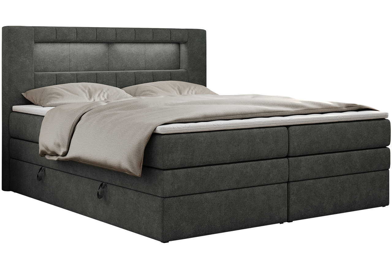 Główny materac kieszeniowy Multipocket dostarcza doskonałego wsparcia dla ciała, dzięki wysokoelastycznej piance T-30 co jest kluczowe dla zdrowego snu. Jego konstrukcja z niezależnymi kieszeniami minimalizuje przenoszenie ruchu. Dodatkowo, materac nawierzchniowy wykończony pianką T-25 zapewnia uczucie miękkości i komfortu, dostosowując się do kształtu ciała. Łóżko wyposażone w 2 poziomy materacy to rozwiązanie podnoszące znacząco komfort snu. Dwa pojemniki na pościel to praktyczne rozwiązanie, które pozwoli na łatwe przechowywanie pościeli i utrzymanie porządku. Automat na podnośnikach gazowych sprawia, że otwieranie pojemników jest wygodne i szybkie. Tapicerowany zagłówek to prawdziwa ozdoba, która dodaje wnętrzu klasy i staje się centralnym punktem każdej sypialni. W wezgłowiu znajduje się praktyczna wnęka z oświetleniem LED.