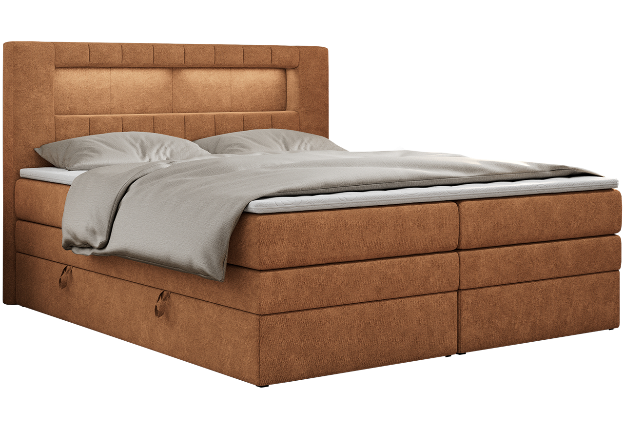 Główny materac kieszeniowy Multipocket dostarcza doskonałego wsparcia dla ciała, dzięki wysokoelastycznej piance T-30 co jest kluczowe dla zdrowego snu. Jego konstrukcja z niezależnymi kieszeniami minimalizuje przenoszenie ruchu. Dodatkowo, materac nawierzchniowy wykończony pianką T-25 zapewnia uczucie miękkości i komfortu, dostosowując się do kształtu ciała. Łóżko wyposażone w 2 poziomy materacy to rozwiązanie podnoszące znacząco komfort snu. Dwa pojemniki na pościel to praktyczne rozwiązanie, które pozwoli na łatwe przechowywanie pościeli i utrzymanie porządku. Automat na podnośnikach gazowych sprawia, że otwieranie pojemników jest wygodne i szybkie. Tapicerowany zagłówek to prawdziwa ozdoba, która dodaje wnętrzu klasy i staje się centralnym punktem każdej sypialni. W wezgłowiu znajduje się praktyczna wnęka z oświetleniem LED.