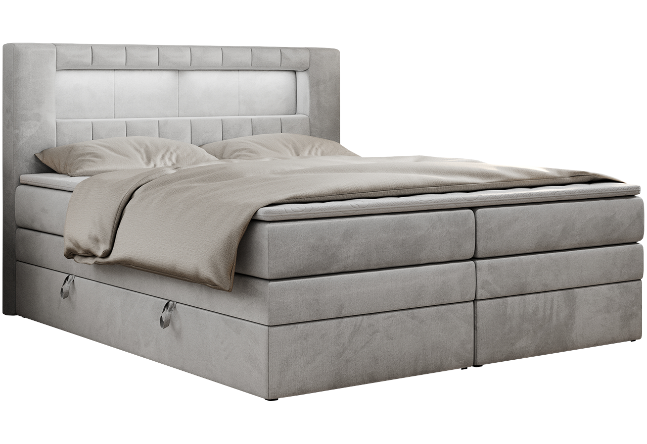 Główny materac kieszeniowy Multipocket dostarcza doskonałego wsparcia dla ciała, dzięki wysokoelastycznej piance T-30 co jest kluczowe dla zdrowego snu. Jego konstrukcja z niezależnymi kieszeniami minimalizuje przenoszenie ruchu. Dodatkowo, materac nawierzchniowy wykończony pianką T-25 zapewnia uczucie miękkości i komfortu, dostosowując się do kształtu ciała. Łóżko wyposażone w 2 poziomy materacy to rozwiązanie podnoszące znacząco komfort snu. Dwa pojemniki na pościel to praktyczne rozwiązanie, które pozwoli na łatwe przechowywanie pościeli i utrzymanie porządku. Automat na podnośnikach gazowych sprawia, że otwieranie pojemników jest wygodne i szybkie. Tapicerowany zagłówek to prawdziwa ozdoba, która dodaje wnętrzu klasy i staje się centralnym punktem każdej sypialni. W wezgłowiu znajduje się praktyczna wnęka z oświetleniem LED.
