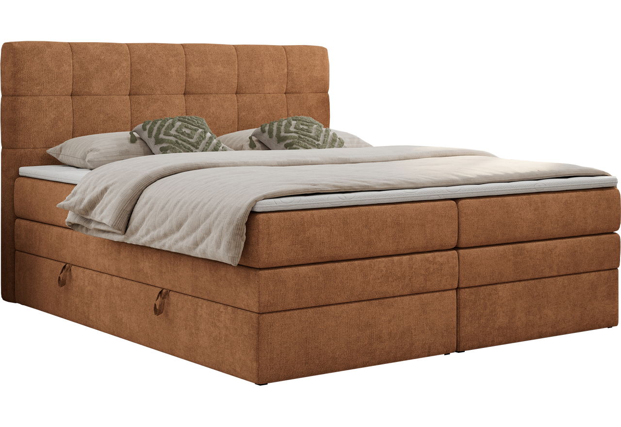 Główny materac kieszeniowy Multipocket dostarcza doskonałego wsparcia dla ciała, dzięki wysokoelastycznej piance T-30 co jest kluczowe dla zdrowego snu. Jego konstrukcja z niezależnymi kieszeniami minimalizuje przenoszenie ruchu. Dodatkowo, materac nawierzchniowy wykończony pianką T-25 zapewnia uczucie miękkości i komfortu, dostosowując się do kształtu ciała. Łóżko wyposażone w 2 poziomy materacy to rozwiązanie podnoszące znacząco komfort snu. Dwa pojemniki na pościel to praktyczne rozwiązanie, które pozwoli na łatwe przechowywanie pościeli i utrzymanie porządku. Automat na podnośnikach gazowych sprawia, że otwieranie pojemników jest wygodne i szybkie. Tapicerowany zagłówek to prawdziwa ozdoba, która dodaje wnętrzu klasy i staje się centralnym punktem każdej sypialni.