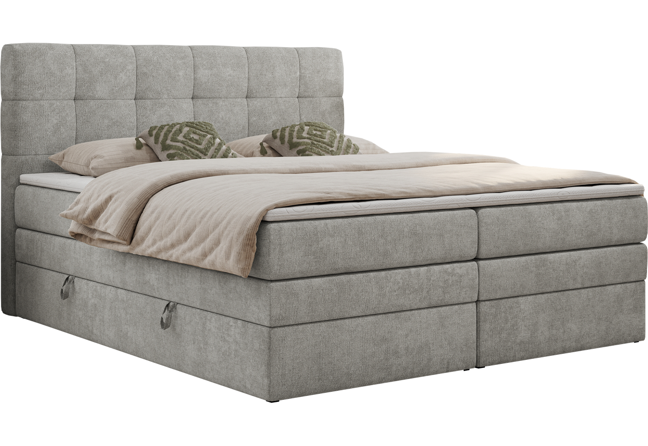 Główny materac kieszeniowy Multipocket dostarcza doskonałego wsparcia dla ciała, dzięki wysokoelastycznej piance T-30 co jest kluczowe dla zdrowego snu. Jego konstrukcja z niezależnymi kieszeniami minimalizuje przenoszenie ruchu. Dodatkowo, materac nawierzchniowy wykończony pianką T-25 zapewnia uczucie miękkości i komfortu, dostosowując się do kształtu ciała. Łóżko wyposażone w 2 poziomy materacy to rozwiązanie podnoszące znacząco komfort snu. Dwa pojemniki na pościel to praktyczne rozwiązanie, które pozwoli na łatwe przechowywanie pościeli i utrzymanie porządku. Automat na podnośnikach gazowych sprawia, że otwieranie pojemników jest wygodne i szybkie. Tapicerowany zagłówek to prawdziwa ozdoba, która dodaje wnętrzu klasy i staje się centralnym punktem każdej sypialni.