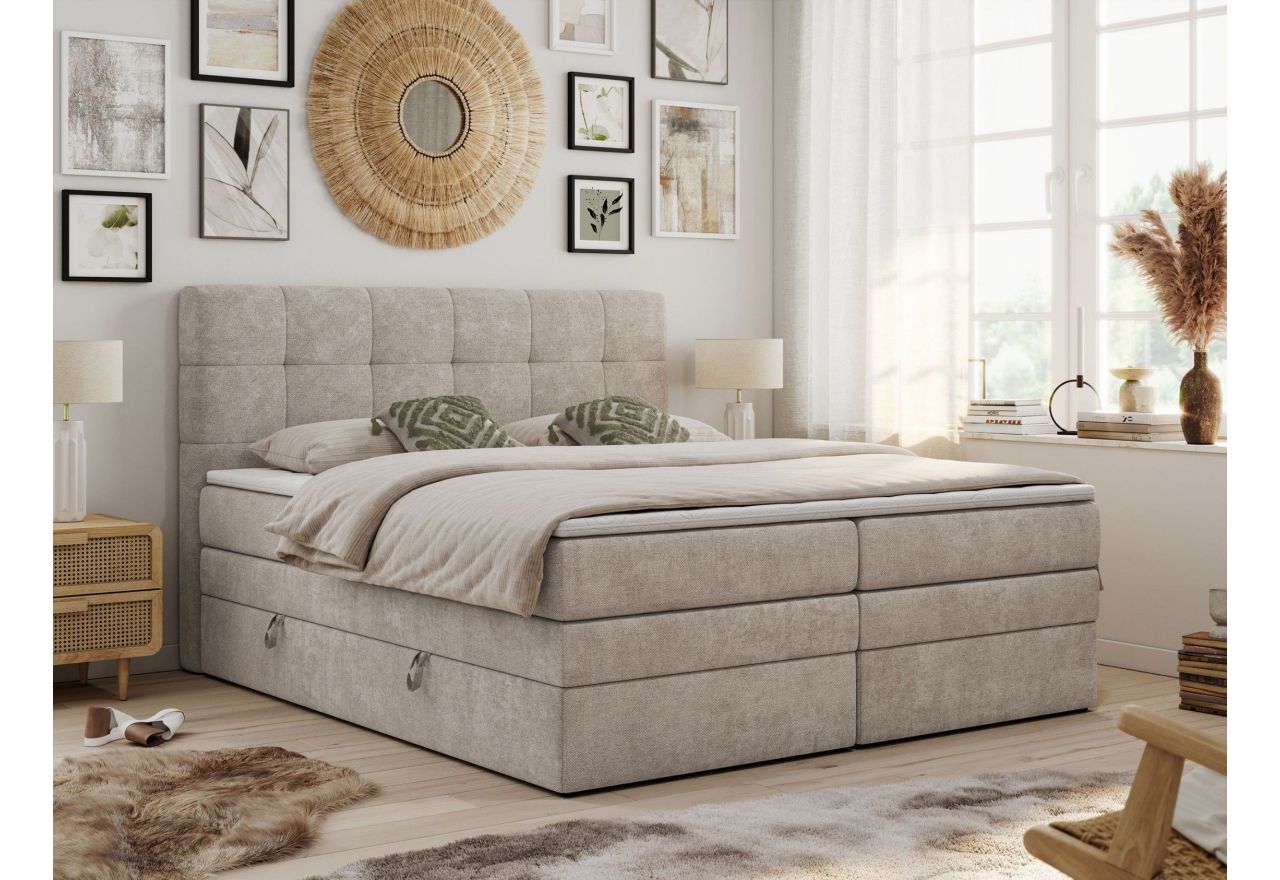 Główny materac kieszeniowy Multipocket dostarcza doskonałego wsparcia dla ciała, dzięki wysokoelastycznej piance T-30 co jest kluczowe dla zdrowego snu. Jego konstrukcja z niezależnymi kieszeniami minimalizuje przenoszenie ruchu. Dodatkowo, materac nawierzchniowy wykończony pianką T-25 zapewnia uczucie miękkości i komfortu, dostosowując się do kształtu ciała. Łóżko wyposażone w 2 poziomy materacy to rozwiązanie podnoszące znacząco komfort snu. Dwa pojemniki na pościel to praktyczne rozwiązanie, które pozwoli na łatwe przechowywanie pościeli i utrzymanie porządku. Automat na podnośnikach gazowych sprawia, że otwieranie pojemników jest wygodne i szybkie. Tapicerowany zagłówek to prawdziwa ozdoba, która dodaje wnętrzu klasy i staje się centralnym punktem każdej sypialni.