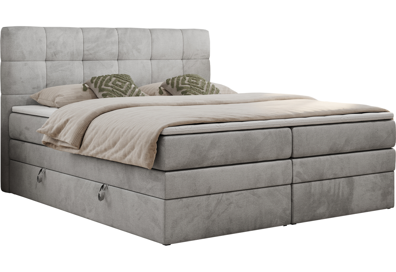 Główny materac kieszeniowy Multipocket dostarcza doskonałego wsparcia dla ciała, dzięki wysokoelastycznej piance T-30 co jest kluczowe dla zdrowego snu. Jego konstrukcja z niezależnymi kieszeniami minimalizuje przenoszenie ruchu. Dodatkowo, materac nawierzchniowy wykończony pianką T-25 zapewnia uczucie miękkości i komfortu, dostosowując się do kształtu ciała. Łóżko wyposażone w 2 poziomy materacy to rozwiązanie podnoszące znacząco komfort snu. Dwa pojemniki na pościel to praktyczne rozwiązanie, które pozwoli na łatwe przechowywanie pościeli i utrzymanie porządku. Automat na podnośnikach gazowych sprawia, że otwieranie pojemników jest wygodne i szybkie. Tapicerowany zagłówek to prawdziwa ozdoba, która dodaje wnętrzu klasy i staje się centralnym punktem każdej sypialni.