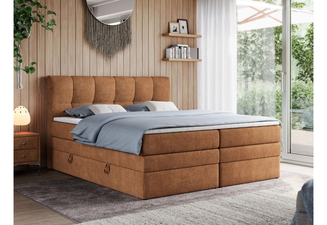 Główny materac kieszeniowy Multipocket dostarcza doskonałego wsparcia dla ciała, dzięki wysokoelastycznej piance T-30 co jest kluczowe dla zdrowego snu. Jego konstrukcja z niezależnymi kieszeniami minimalizuje przenoszenie ruchu. Dodatkowo, materac nawierzchniowy wykończony pianką T-25 zapewnia uczucie miękkości i komfortu, dostosowując się do kształtu ciała. Łóżko wyposażone w 2 poziomy materacy to rozwiązanie podnoszące znacząco komfort snu. Dwa pojemniki na pościel to praktyczne rozwiązanie, które pozwoli na łatwe przechowywanie pościeli i utrzymanie porządku. Automat na sprężynach sprawia, że otwieranie pojemników jest wygodne i szybkie. Tapicerowany, pikowany zagłówek to prawdziwa ozdoba, która dodaje wnętrzu klasy i staje się centralnym punktem każdej sypialni.