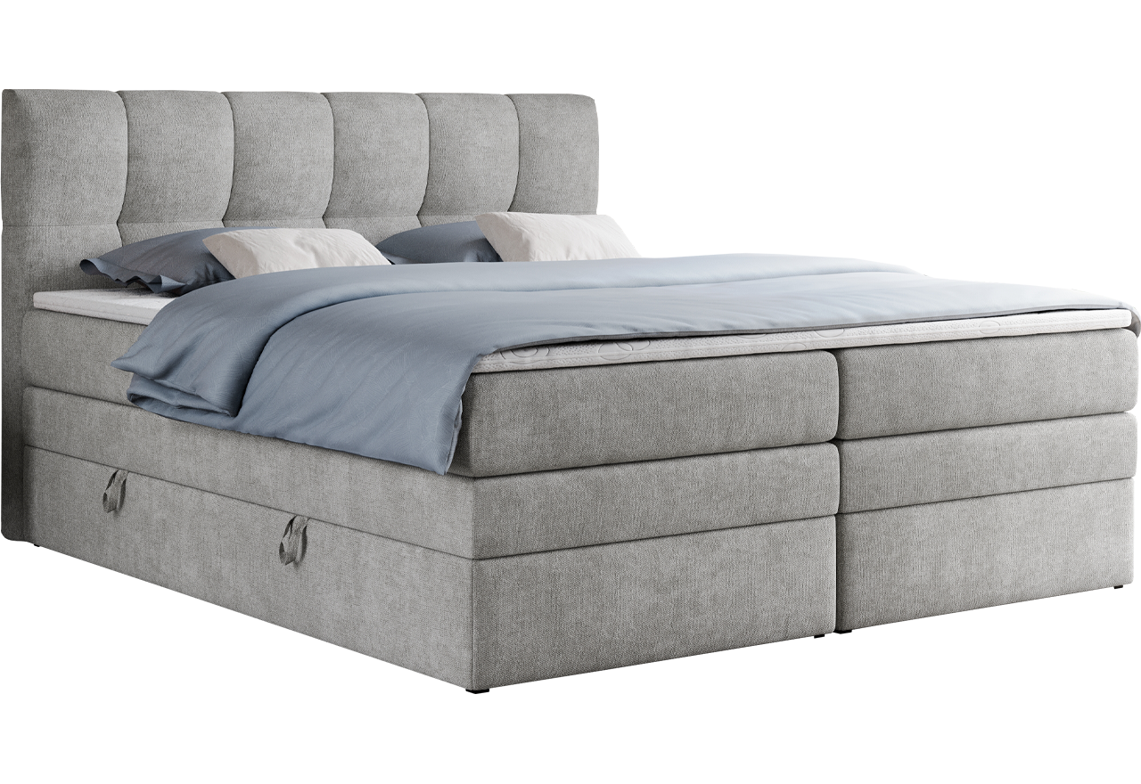Główny materac kieszeniowy Multipocket dostarcza doskonałego wsparcia dla ciała, dzięki wysokoelastycznej piance T-30 co jest kluczowe dla zdrowego snu. Jego konstrukcja z niezależnymi kieszeniami minimalizuje przenoszenie ruchu. Dodatkowo, materac nawierzchniowy wykończony pianką T-25 zapewnia uczucie miękkości i komfortu, dostosowując się do kształtu ciała. Łóżko wyposażone w 2 poziomy materacy to rozwiązanie podnoszące znacząco komfort snu. Dwa pojemniki na pościel to praktyczne rozwiązanie, które pozwoli na łatwe przechowywanie pościeli i utrzymanie porządku. Automat na sprężynach sprawia, że otwieranie pojemników jest wygodne i szybkie. Tapicerowany, pikowany zagłówek to prawdziwa ozdoba, która dodaje wnętrzu klasy i staje się centralnym punktem każdej sypialni.