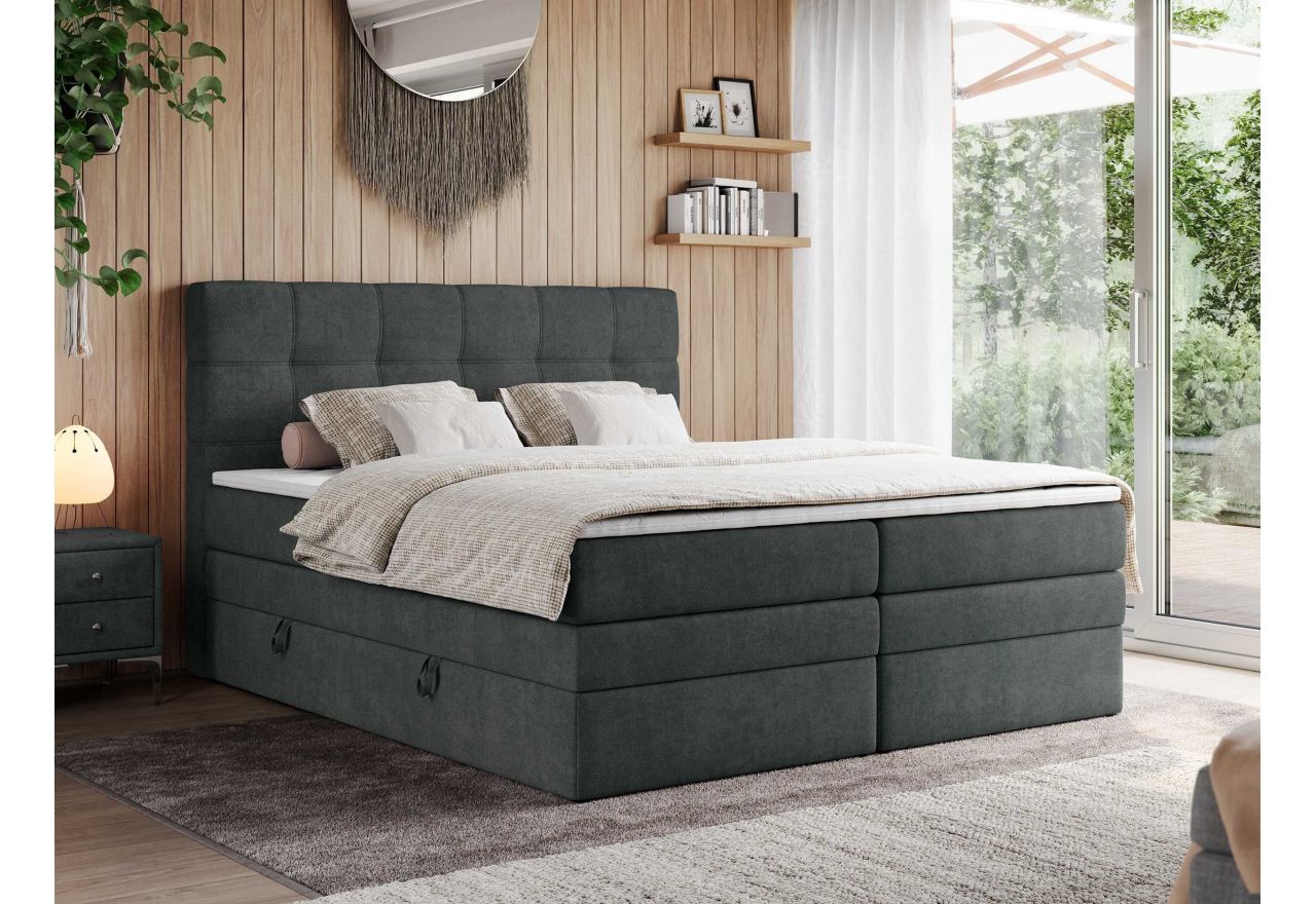 Główny materac kieszeniowy Multipocket dostarcza doskonałego wsparcia dla ciała, dzięki wysokoelastycznej piance T-30 co jest kluczowe dla zdrowego snu. Jego konstrukcja z niezależnymi kieszeniami minimalizuje przenoszenie ruchu. Dodatkowo, materac nawierzchniowy wykończony pianką T-25 zapewnia uczucie miękkości i komfortu, dostosowując się do kształtu ciała. Łóżko wyposażone w 2 poziomy materacy to rozwiązanie podnoszące znacząco komfort snu. Dwa pojemniki na pościel to praktyczne rozwiązanie, które pozwoli na łatwe przechowywanie pościeli i utrzymanie porządku. Automat na sprężynach sprawia, że otwieranie pojemników jest wygodne i szybkie. Tapicerowany zagłówek to prawdziwa ozdoba, która dodaje wnętrzu klasy i staje się centralnym punktem każdej sypialni.
