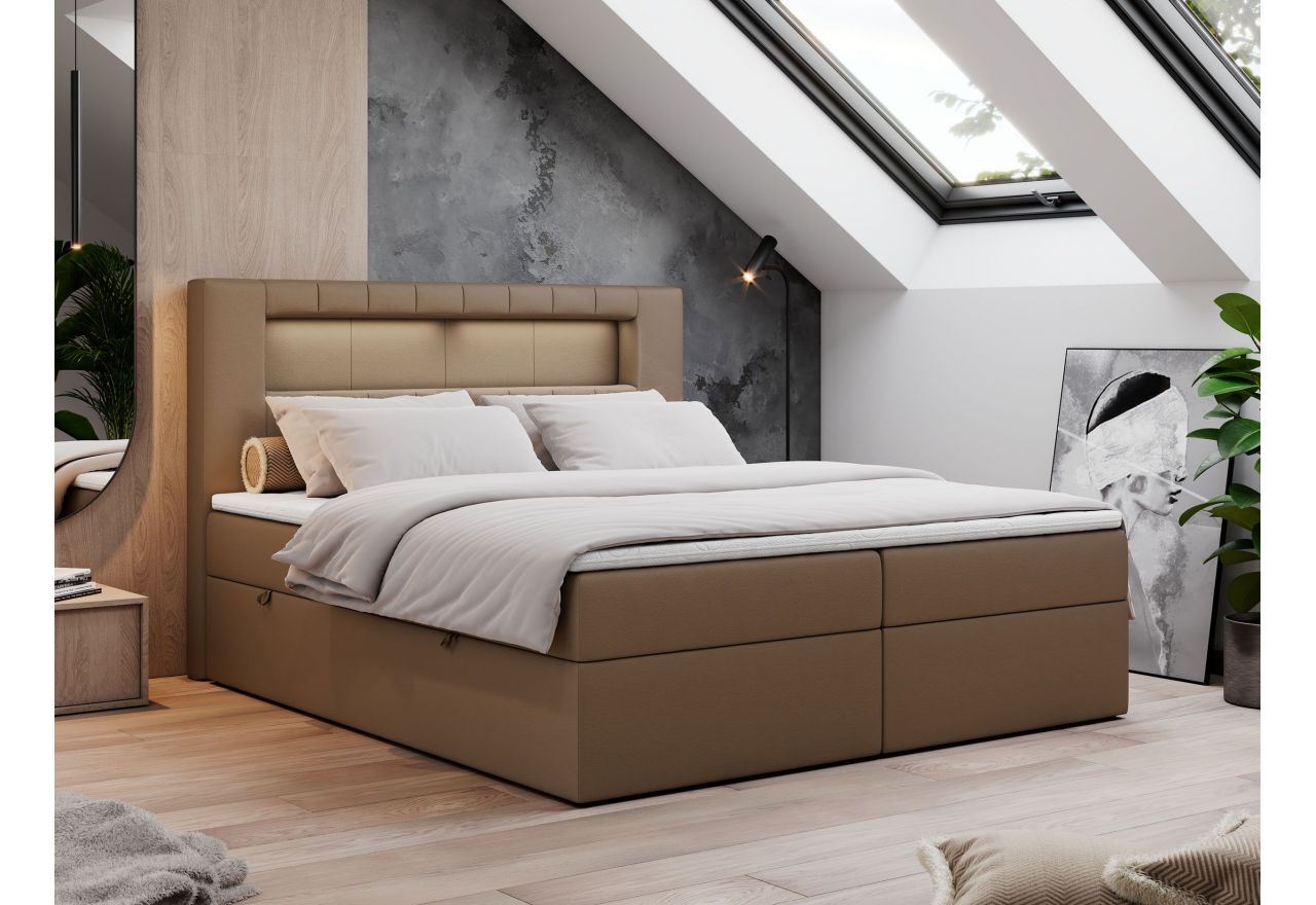 Główny materac kieszeniowy Multipocket dostarcza doskonałego wsparcia dla ciała, dzięki wysokoelastycznej piance T-30 co jest kluczowe dla zdrowego snu. Jego konstrukcja z niezależnymi kieszeniami minimalizuje przenoszenie ruchu. Dodatkowo, materac nawierzchniowy wykończony pianką T-25 zapewnia uczucie miękkości i komfortu, dostosowując się do kształtu ciała. Dwa pojemniki na pościel to praktyczne rozwiązanie, które pozwoli na łatwe przechowywanie pościeli i utrzymanie porządku. Automat na sprężynach sprawia, że otwieranie pojemników jest wygodne i szybkie. Tapicerowany zagłówek to prawdziwa ozdoba, która dodaje wnętrzu klasy i staje się centralnym punktem każdej sypialni. W wezgłowiu znajduje się praktyczna wnęka z oświetleniem LED.