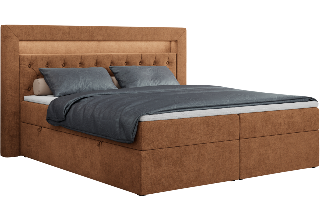 Główny materac kieszeniowy Multipocket dostarcza doskonałego wsparcia dla ciała, dzięki wysokoelastycznej piance T-30 co jest kluczowe dla zdrowego snu. Jego konstrukcja z niezależnymi kieszeniami minimalizuje przenoszenie ruchu. Dodatkowo, materac nawierzchniowy wykończony pianką T-25 zapewnia uczucie miękkości i komfortu, dostosowując się do kształtu ciała. Dwa pojemniki na pościel to praktyczne rozwiązanie, które pozwoli na łatwe przechowywanie pościeli i utrzymanie porządku. Automat na sprężynach sprawia, że otwieranie pojemników jest wygodne i szybkie. Tapicerowany, pikowany zagłówek to prawdziwa ozdoba, która dodaje wnętrzu klasy i staje się centralnym punktem każdej sypialni. W wezgłowiu znajduje się praktyczna wnęka z oświetleniem LED.