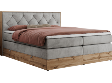 Główny materac kieszeniowy Multipocket dostarcza doskonałego wsparcia dla ciała, dzięki wysokoelastycznej piance T-30 co jest kluczowe dla zdrowego snu. Jego konstrukcja z niezależnymi kieszeniami minimalizuje przenoszenie ruchu. Dodatkowo, materac nawierzchniowy wykończony pianką T-25 zapewnia uczucie miękkości i komfortu, dostosowując się do kształtu ciała. Dwa pojemniki na pościel to praktyczne rozwiązanie, które pozwoli na łatwe przechowywanie pościeli i utrzymanie porządku. Automat na sprężynach sprawia, że otwieranie pojemników jest wygodne i szybkie. Tapicerowany, pikowany zagłówek to prawdziwa ozdoba, która dodaje wnętrzu klasy i staje się centralnym punktem każdej sypialni. W wezgłowiu znajduje się praktyczna wnęka z oświetleniem LED.