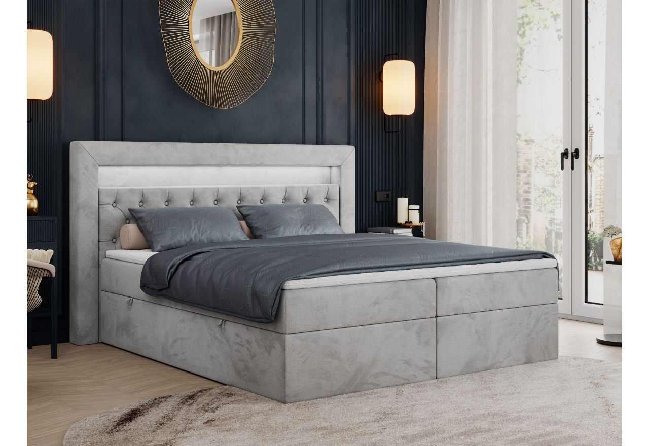 Główny materac kieszeniowy Multipocket dostarcza doskonałego wsparcia dla ciała, dzięki wysokoelastycznej piance T-30 co jest kluczowe dla zdrowego snu. Jego konstrukcja z niezależnymi kieszeniami minimalizuje przenoszenie ruchu. Dodatkowo, materac nawierzchniowy wykończony pianką T-25 zapewnia uczucie miękkości i komfortu, dostosowując się do kształtu ciała. Dwa pojemniki na pościel to praktyczne rozwiązanie, które pozwoli na łatwe przechowywanie pościeli i utrzymanie porządku. Automat na sprężynach sprawia, że otwieranie pojemników jest wygodne i szybkie. Tapicerowany, pikowany zagłówek to prawdziwa ozdoba, która dodaje wnętrzu klasy i staje się centralnym punktem każdej sypialni. W wezgłowiu znajduje się praktyczna wnęka z oświetleniem LED.