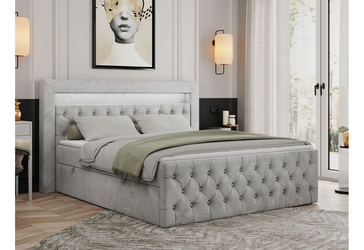 Główny materac kieszeniowy Multipocket dostarcza doskonałego wsparcia dla ciała, dzięki wysokoelastycznej piance T-30 co jest kluczowe dla zdrowego snu. Jego konstrukcja z niezależnymi kieszeniami minimalizuje przenoszenie ruchu. Dodatkowo, materac nawierzchniowy wykończony pianką T-25 zapewnia uczucie miękkości i komfortu, dostosowując się do kształtu ciała. Dwa pojemniki na pościel to praktyczne rozwiązanie, które pozwoli na łatwe przechowywanie pościeli i utrzymanie porządku. Automat na sprężynach sprawia, że otwieranie pojemników jest wygodne i szybkie. Tapicerowany, pikowany zagłówek to prawdziwa ozdoba, która dodaje wnętrzu klasy i staje się centralnym punktem każdej sypialni. W wezgłowiu znajduje się praktyczna wnęka z oświetleniem LED.