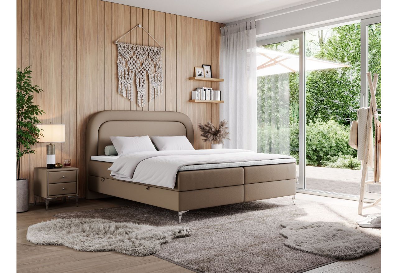 Główny materac kieszeniowy Multipocket dostarcza doskonałego wsparcia dla ciała, dzięki wysokoelastycznej piance T-30 co jest kluczowe dla zdrowego snu. Jego konstrukcja z niezależnymi kieszeniami minimalizuje przenoszenie ruchu. Dodatkowo, materac nawierzchniowy wykończony pianką T-25 zapewnia uczucie miękkości i komfortu, dostosowując się do kształtu ciała. Dwa pojemniki na pościel to praktyczne rozwiązanie, które pozwoli na łatwe przechowywanie pościeli i utrzymanie porządku. Automat na sprężynach sprawia, że otwieranie pojemników jest wygodne i szybkie. Tapicerowany zagłówek to prawdziwa ozdoba, która dodaje wnętrzu klasy i staje się centralnym punktem każdej sypialni.