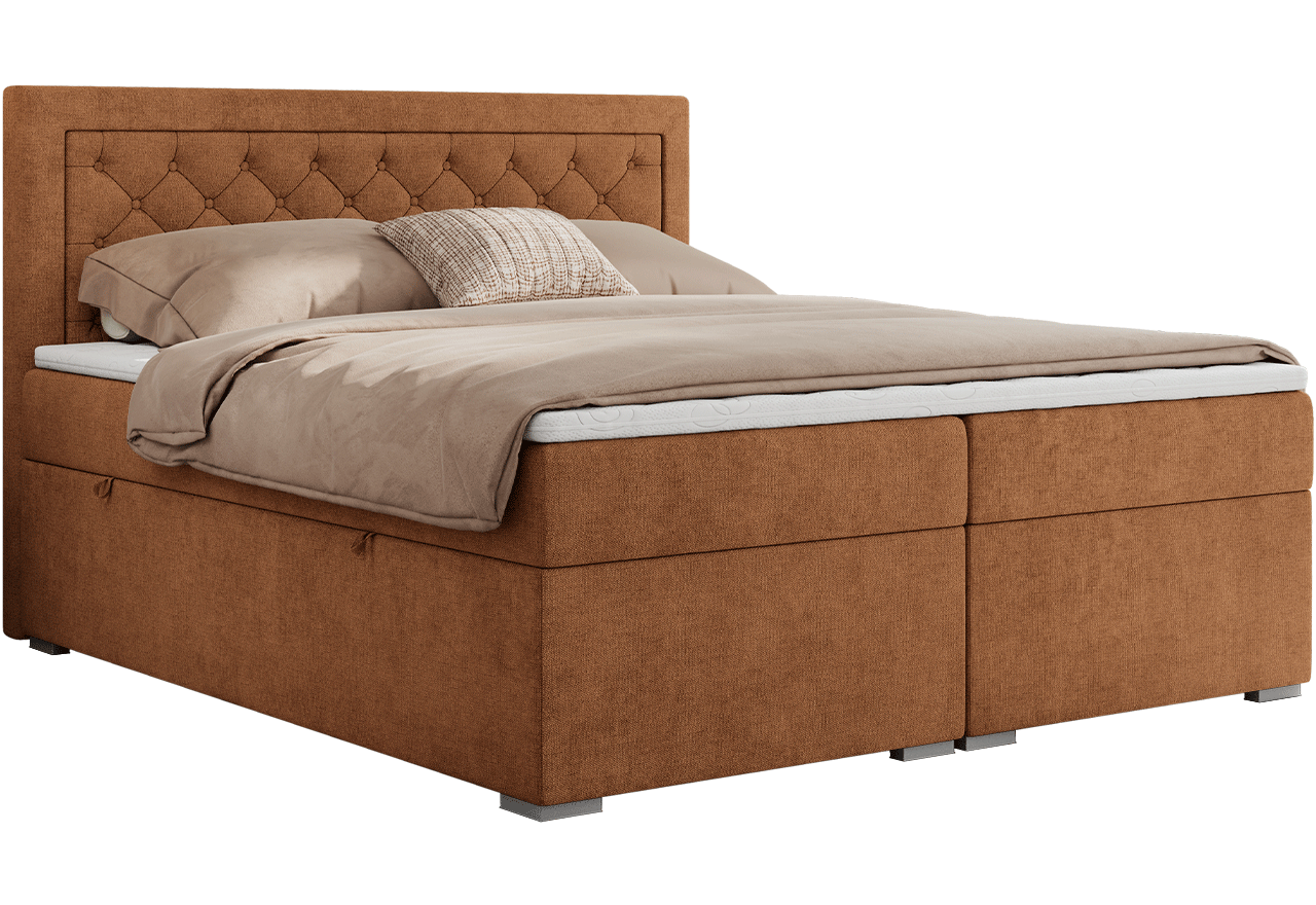 Główny materac kieszeniowy Multipocket dostarcza doskonałego wsparcia dla ciała, dzięki wysokoelastycznej piance T-30 co jest kluczowe dla zdrowego snu. Jego konstrukcja z niezależnymi kieszeniami minimalizuje przenoszenie ruchu. Dodatkowo, materac nawierzchniowy wykończony pianką T-25 zapewnia uczucie miękkości i komfortu, dostosowując się do kształtu ciała. Dwa pojemniki na pościel to praktyczne rozwiązanie, które pozwoli na łatwe przechowywanie pościeli i utrzymanie porządku. Automat na sprężynach sprawia, że otwieranie pojemników jest wygodne i szybkie. Tapicerowany zagłówek to prawdziwa ozdoba, która dodaje wnętrzu klasy i staje się centralnym punktem każdej sypialni.