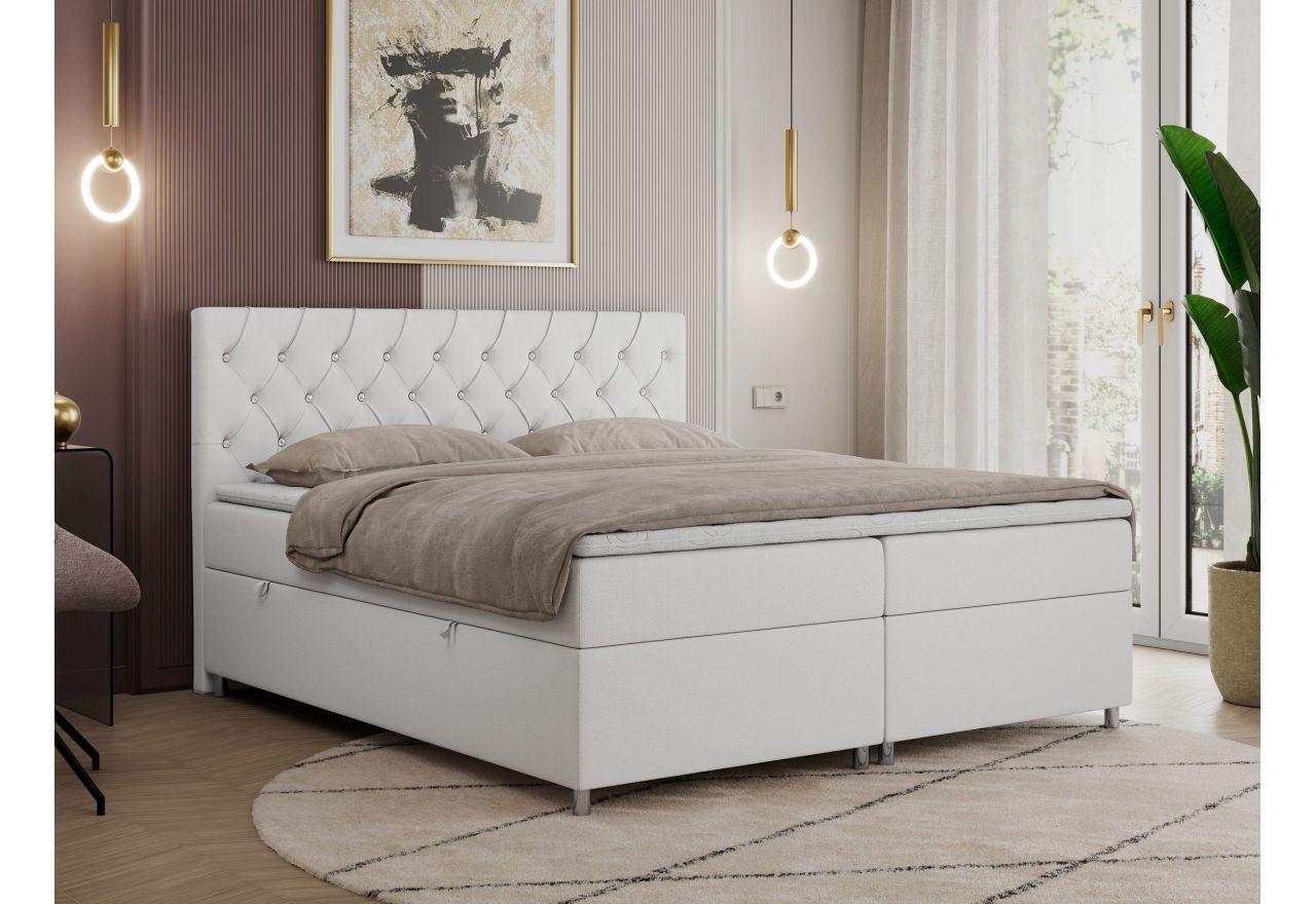 Główny materac kieszeniowy Multipocket dostarcza doskonałego wsparcia dla ciała, dzięki wysokoelastycznej piance T-30 co jest kluczowe dla zdrowego snu. Jego konstrukcja z niezależnymi kieszeniami minimalizuje przenoszenie ruchu. Dodatkowo, materac nawierzchniowy wykończony pianką T-25 zapewnia uczucie miękkości i komfortu, dostosowując się do kształtu ciała. Dwa pojemniki na pościel to praktyczne rozwiązanie, które pozwoli na łatwe przechowywanie pościeli i utrzymanie porządku. Automat na sprężynach sprawia, że otwieranie pojemników jest wygodne i szybkie. Tapicerowany, pikowany kryształkami zagłówek to prawdziwa ozdoba, która dodaje wnętrzu klasy i staje się centralnym punktem każdej sypialni.