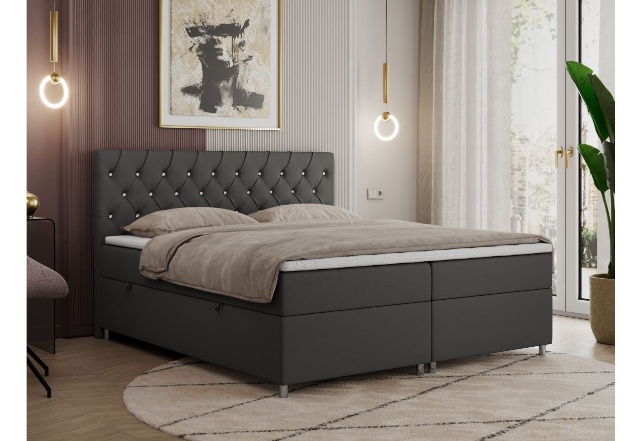 Główny materac kieszeniowy Multipocket dostarcza doskonałego wsparcia dla ciała, dzięki wysokoelastycznej piance T-30 co jest kluczowe dla zdrowego snu. Jego konstrukcja z niezależnymi kieszeniami minimalizuje przenoszenie ruchu. Dodatkowo, materac nawierzchniowy wykończony pianką T-25 zapewnia uczucie miękkości i komfortu, dostosowując się do kształtu ciała. Dwa pojemniki na pościel to praktyczne rozwiązanie, które pozwoli na łatwe przechowywanie pościeli i utrzymanie porządku. Automat na sprężynach sprawia, że otwieranie pojemników jest wygodne i szybkie. Tapicerowany, pikowany kryształkami zagłówek to prawdziwa ozdoba, która dodaje wnętrzu klasy i staje się centralnym punktem każdej sypialni.