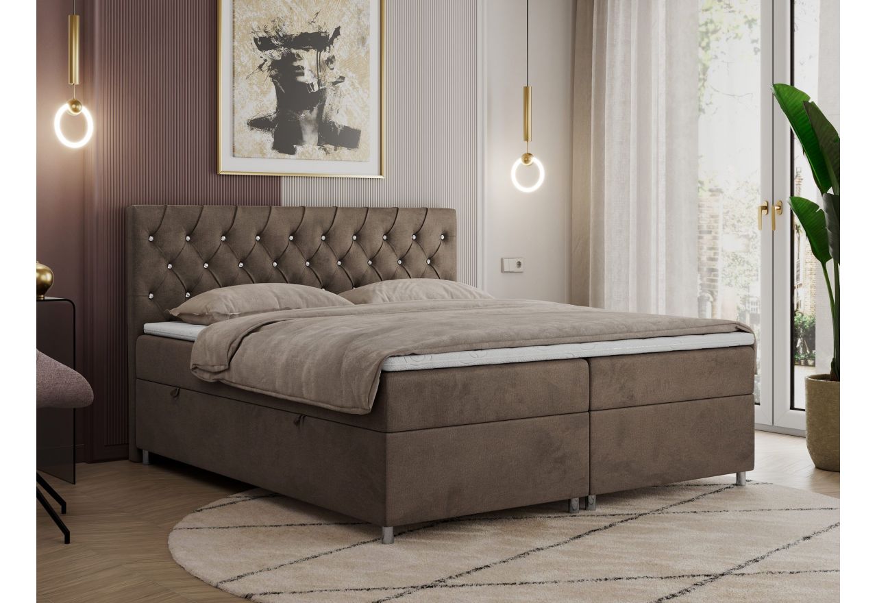 Główny materac kieszeniowy Multipocket dostarcza doskonałego wsparcia dla ciała, dzięki wysokoelastycznej piance T-30 co jest kluczowe dla zdrowego snu. Jego konstrukcja z niezależnymi kieszeniami minimalizuje przenoszenie ruchu. Dodatkowo, materac nawierzchniowy wykończony pianką T-25 zapewnia uczucie miękkości i komfortu, dostosowując się do kształtu ciała. Dwa pojemniki na pościel to praktyczne rozwiązanie, które pozwoli na łatwe przechowywanie pościeli i utrzymanie porządku. Automat na sprężynach sprawia, że otwieranie pojemników jest wygodne i szybkie. Tapicerowany, pikowany kryształkami zagłówek to prawdziwa ozdoba, która dodaje wnętrzu klasy i staje się centralnym punktem każdej sypialni.