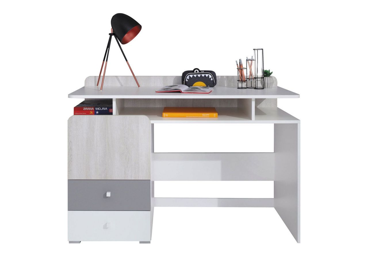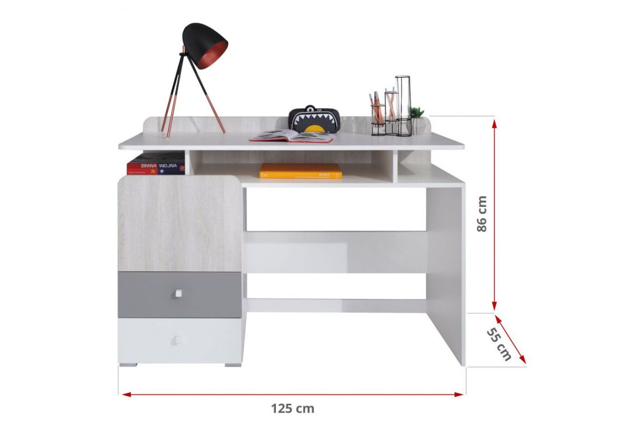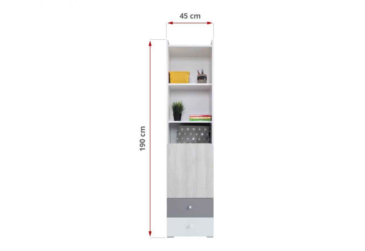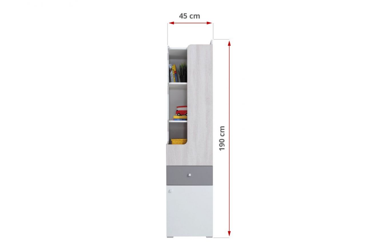 Meble z kolekcji COSMO – idealnie sprawdzą się w pokoju Twojego dziecka, dzięki połączeniu bieli lux, dębu wilton białego i szarości będzie panował w nim porządek i harmonia. W kolekcji znajdziemy między innymi szafy, komody, półki, biurko, regały i łóżka dostępne w dwóch rozmiarach: 90x200 cm oraz 120x200 cm. Łóżka można dodatkowo wyposażyć w materac odpowiedni do danego rozmiaru. Wszystkie bryły zostały wykonane z najwyższej jakości płyty meblowej, która jest odporna na zarysowania i uszkodzenia mechaniczne. Meble nie posiadają ostrych krawędzi. Na obrzeżach znajduję się okleina ABS. Uchwyty wykonane z tworzywa sztucznego. Materiały użyte podczas produkcji gwarantują Twoją satysfakcję oraz użytkowanie przez długie lata. W szufladach zmieszczą się drobniejsze rzeczy Twojej pociechy. Cały system składa się z 13 elementów za pomocą których stworzysz własne aranżacje. Umebluj wymarzony pokój swojemu dziecku dzięki kolekcji mebli COSMO!