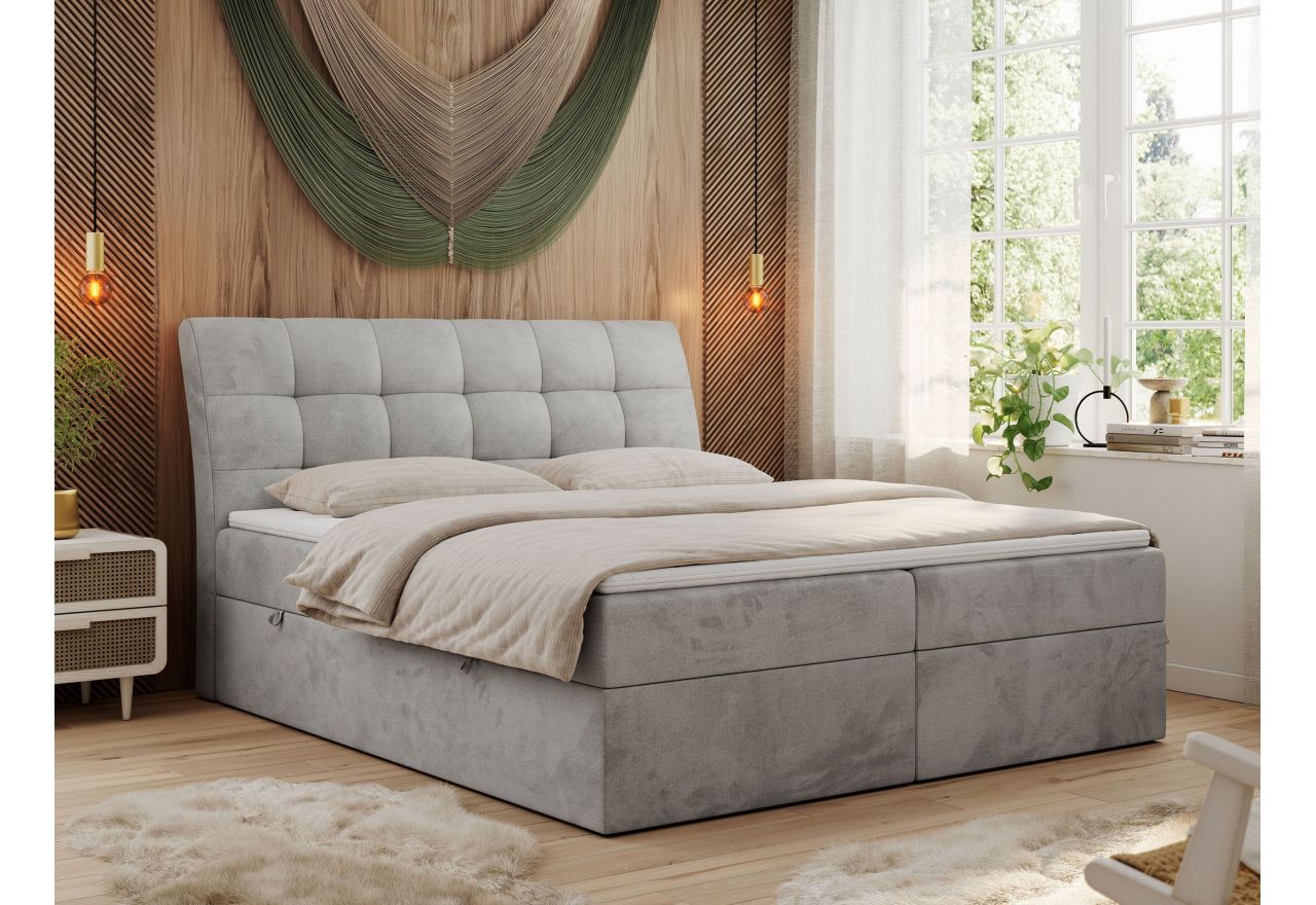Główny materac kieszeniowy Multipocket dostarcza doskonałego wsparcia dla ciała, dzięki wysokoelastycznej piance T-30 co jest kluczowe dla zdrowego snu. Jego konstrukcja z niezależnymi kieszeniami minimalizuje przenoszenie ruchu. Dodatkowo, materac nawierzchniowy wykończony pianką T-25 zapewnia uczucie miękkości i komfortu, dostosowując się do kształtu ciała. Dwa pojemniki na pościel to praktyczne rozwiązanie, które pozwoli na łatwe przechowywanie pościeli i utrzymanie porządku. Automat na sprężynach sprawia, że otwieranie pojemników jest wygodne i szybkie. Tapicerowany, pikowany zagłówek to prawdziwa ozdoba, która dodaje wnętrzu klasy i staje się centralnym punktem każdej sypialni.