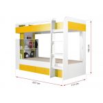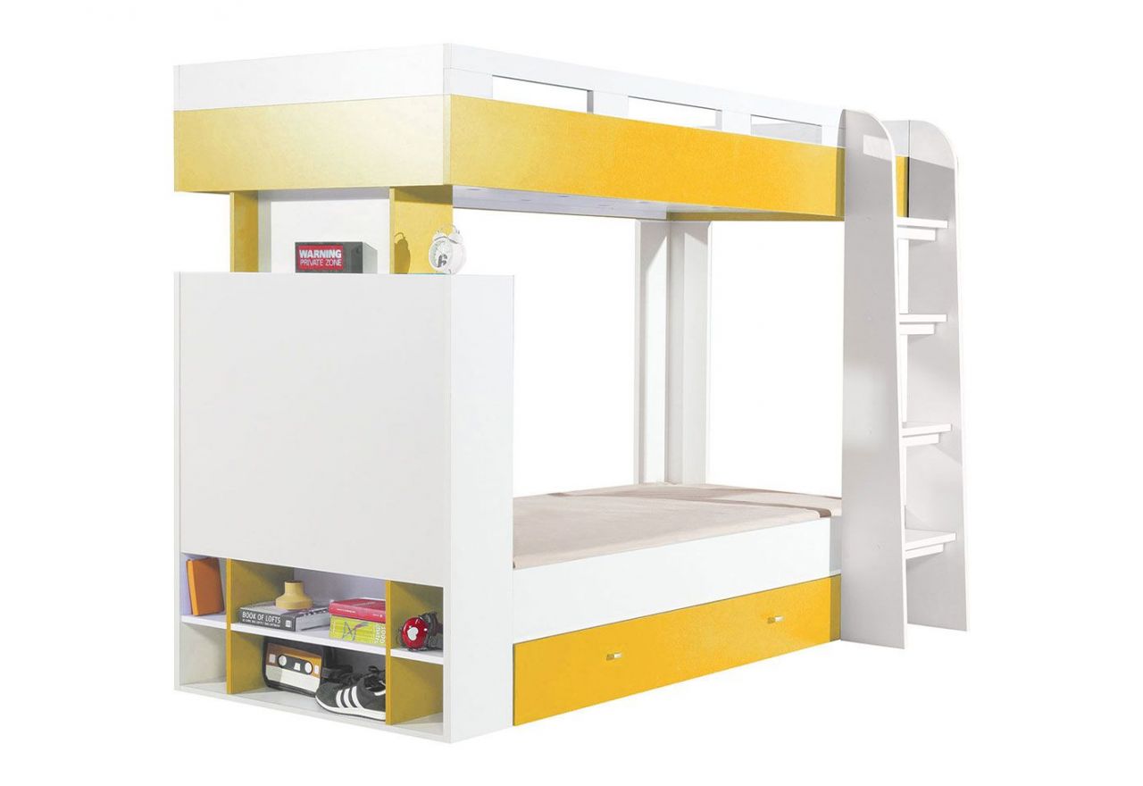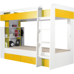 Łóżko piętrowe z drabinką, pojemnikami na pościel oraz półkami w białym kolorze - MODES Biały Lux / Żółty