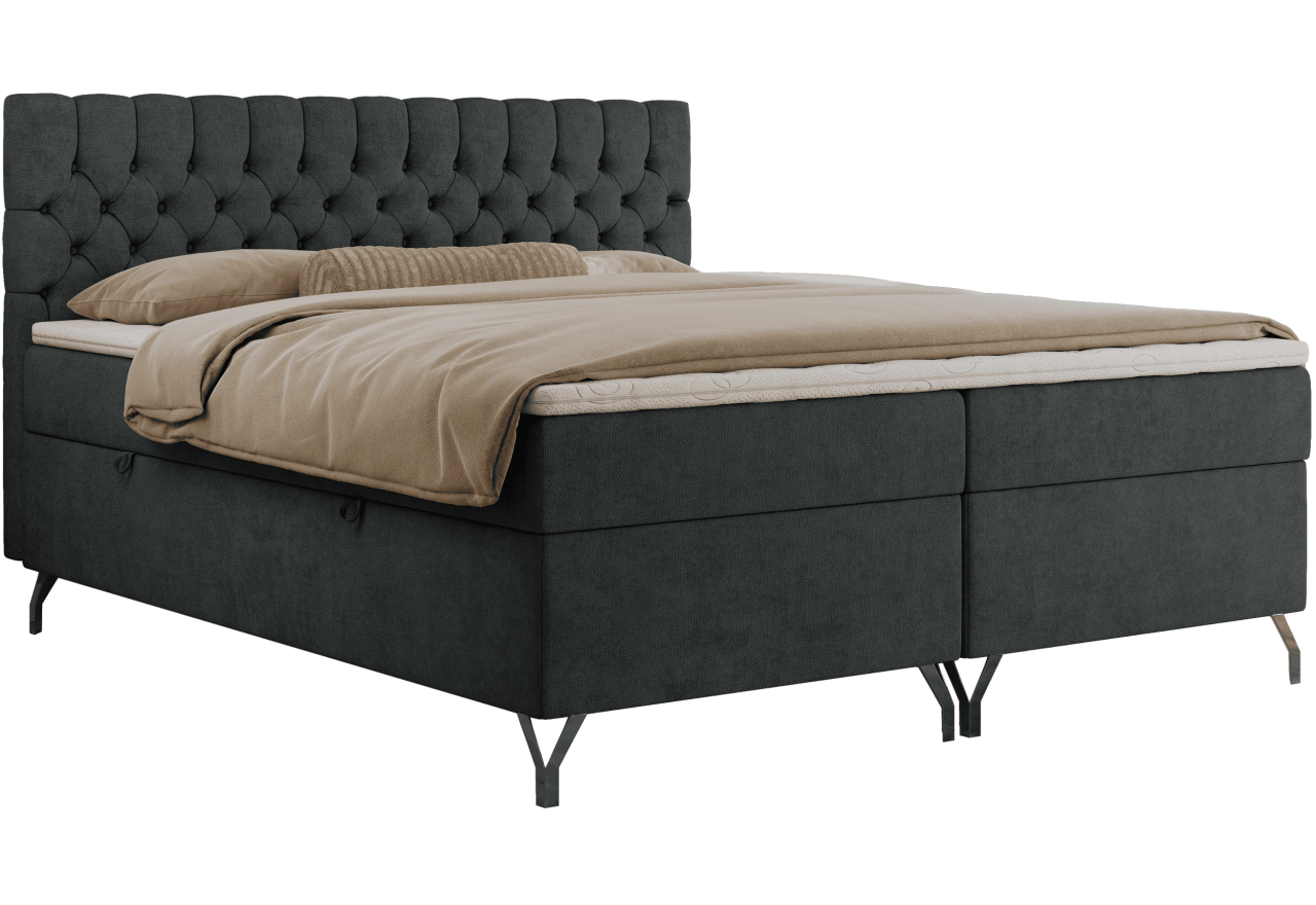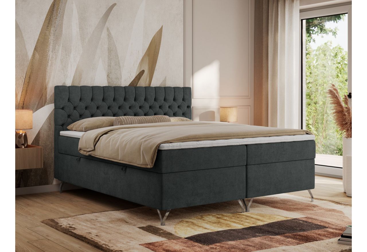 Główny materac kieszeniowy Multipocket dostarcza doskonałego wsparcia dla ciała, dzięki wysokoelastycznej piance T-30 co jest kluczowe dla zdrowego snu. Jego konstrukcja z niezależnymi kieszeniami minimalizuje przenoszenie ruchu. Dodatkowo, materac nawierzchniowy wykończony pianką T-25 zapewnia uczucie miękkości i komfortu, dostosowując się do kształtu ciała. Dwa pojemniki na pościel to praktyczne rozwiązanie, które pozwoli na łatwe przechowywanie pościeli i utrzymanie porządku. Automat na sprężynach sprawia, że otwieranie pojemników jest wygodne i szybkie. Tapicerowany, głęboko pikowany zagłówek to prawdziwa ozdoba, która dodaje wnętrzu klasy i staje się centralnym punktem każdej sypialni.