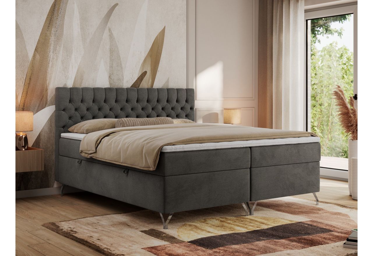 Główny materac kieszeniowy Multipocket dostarcza doskonałego wsparcia dla ciała, dzięki wysokoelastycznej piance T-30 co jest kluczowe dla zdrowego snu. Jego konstrukcja z niezależnymi kieszeniami minimalizuje przenoszenie ruchu. Dodatkowo, materac nawierzchniowy wykończony pianką T-25 zapewnia uczucie miękkości i komfortu, dostosowując się do kształtu ciała. Dwa pojemniki na pościel to praktyczne rozwiązanie, które pozwoli na łatwe przechowywanie pościeli i utrzymanie porządku. Automat na sprężynach sprawia, że otwieranie pojemników jest wygodne i szybkie. Tapicerowany, głęboko pikowany zagłówek to prawdziwa ozdoba, która dodaje wnętrzu klasy i staje się centralnym punktem każdej sypialni.