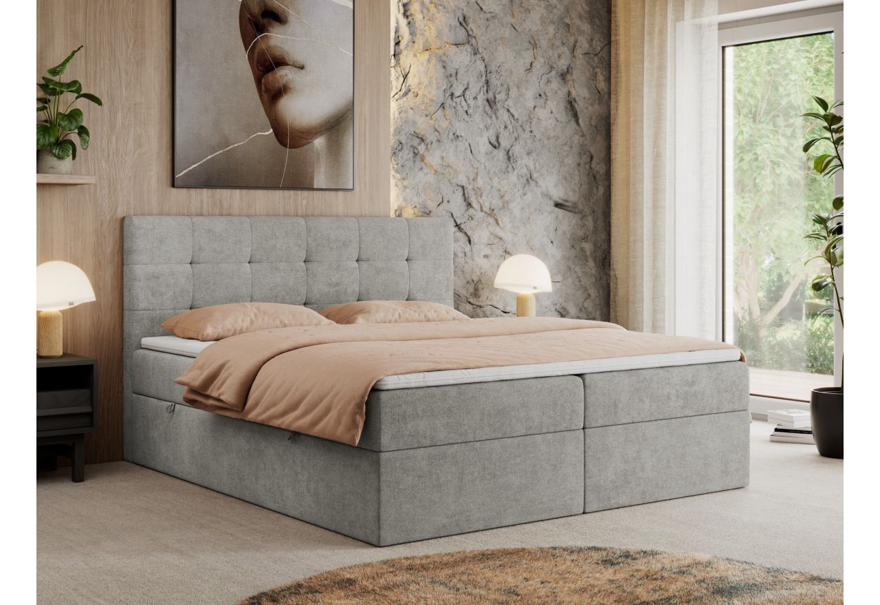 Główny materac kieszeniowy Multipocket dostarcza doskonałego wsparcia dla ciała, dzięki wysokoelastycznej piance T-30 co jest kluczowe dla zdrowego snu. Jego konstrukcja z niezależnymi kieszeniami minimalizuje przenoszenie ruchu. Dodatkowo, materac nawierzchniowy wykończony pianką T-25 zapewnia uczucie miękkości i komfortu, dostosowując się do kształtu ciała. Dwa pojemniki na pościel to praktyczne rozwiązanie, które pozwoli na łatwe przechowywanie pościeli i utrzymanie porządku. Automat na sprężynach sprawia, że otwieranie pojemników jest wygodne i szybkie. Tapicerowany, głęboko pikowany zagłówek to prawdziwa ozdoba, która dodaje wnętrzu klasy i staje się centralnym punktem każdej sypialni.