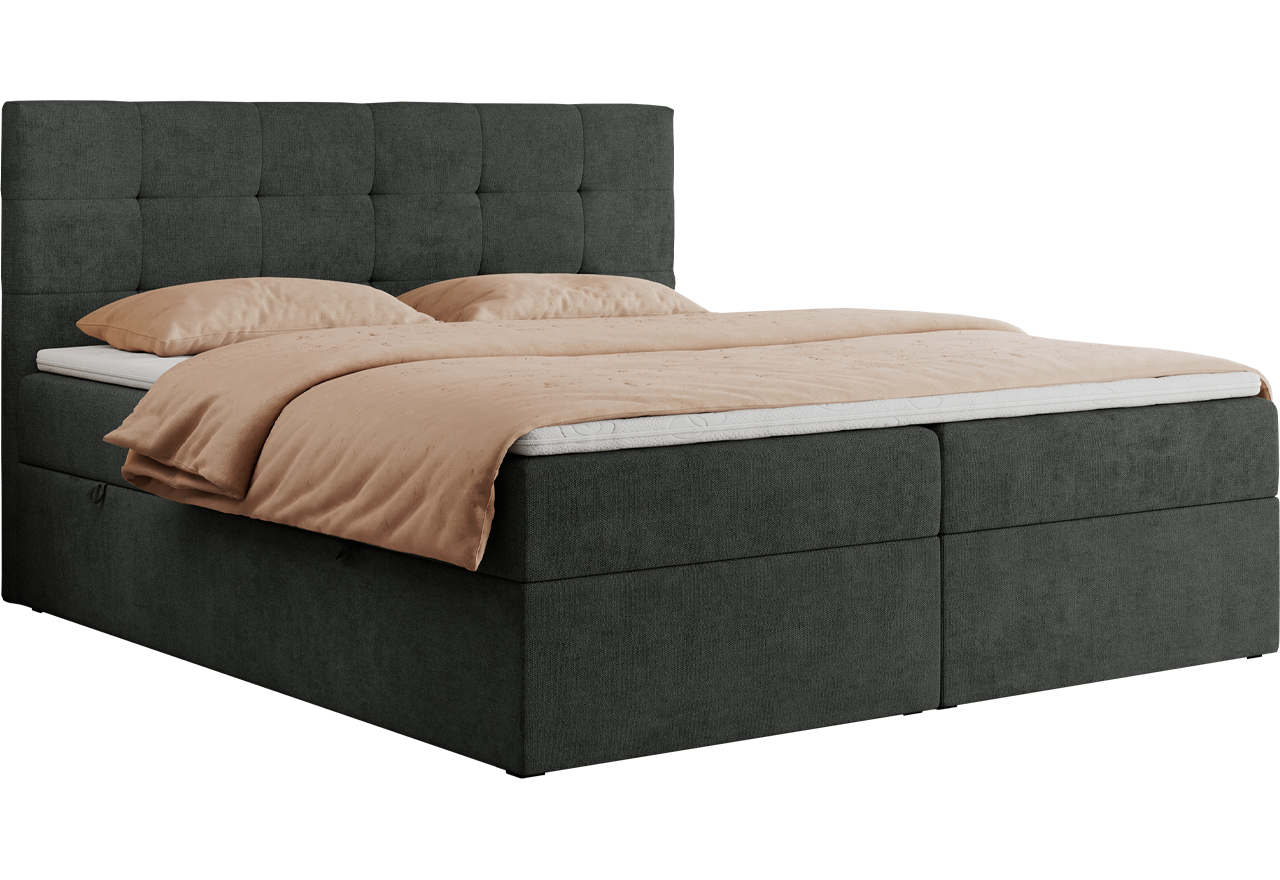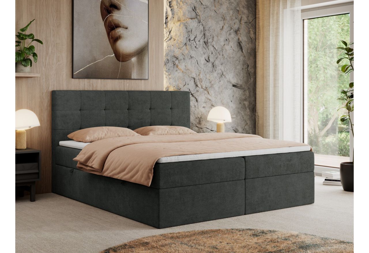 Główny materac kieszeniowy Multipocket dostarcza doskonałego wsparcia dla ciała, dzięki wysokoelastycznej piance T-30 co jest kluczowe dla zdrowego snu. Jego konstrukcja z niezależnymi kieszeniami minimalizuje przenoszenie ruchu. Dodatkowo, materac nawierzchniowy wykończony pianką T-25 zapewnia uczucie miękkości i komfortu, dostosowując się do kształtu ciała. Dwa pojemniki na pościel to praktyczne rozwiązanie, które pozwoli na łatwe przechowywanie pościeli i utrzymanie porządku. Automat na sprężynach sprawia, że otwieranie pojemników jest wygodne i szybkie. Tapicerowany, głęboko pikowany zagłówek to prawdziwa ozdoba, która dodaje wnętrzu klasy i staje się centralnym punktem każdej sypialni.