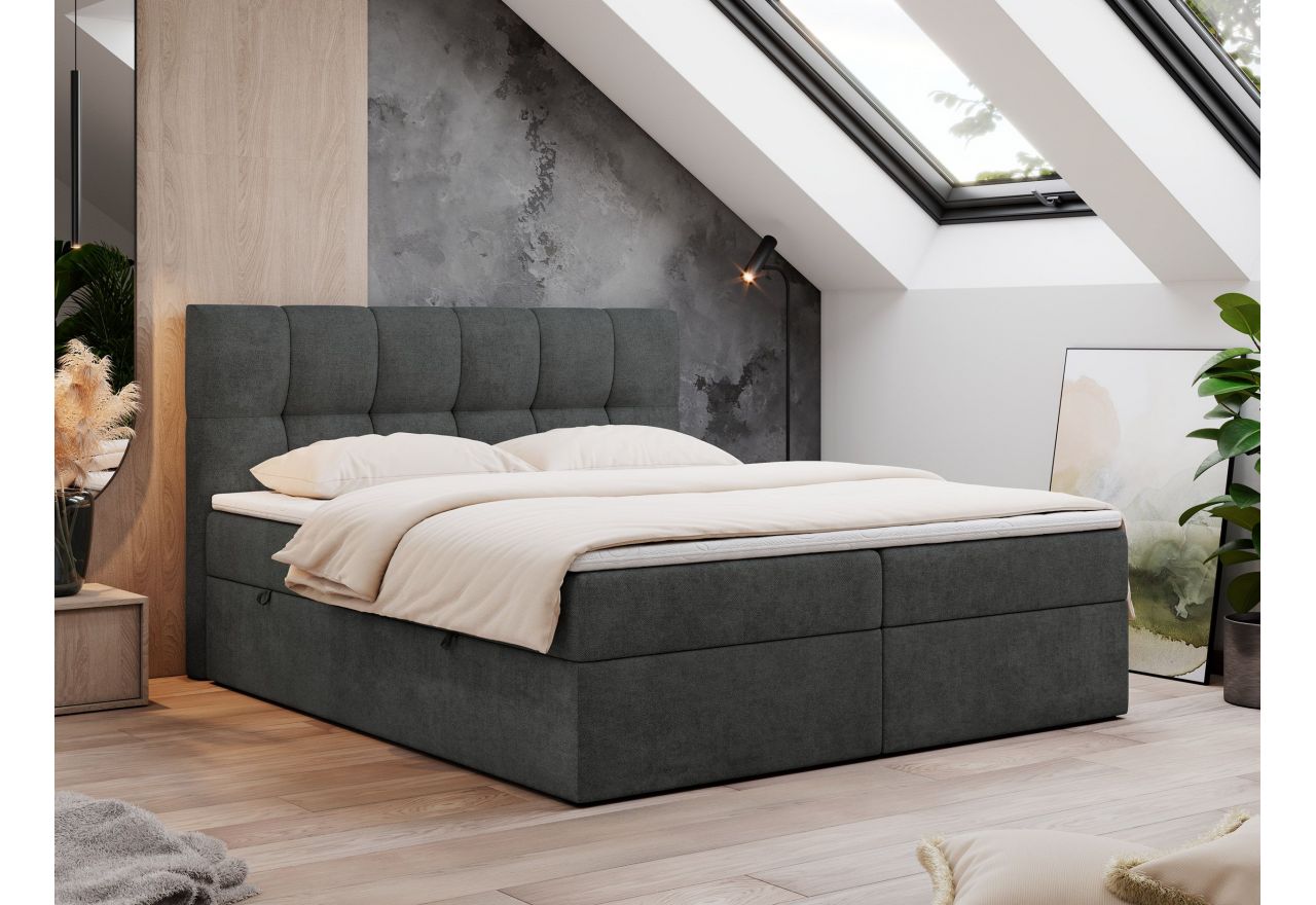Główny materac kieszeniowy Multipocket dostarcza doskonałego wsparcia dla ciała, dzięki wysokoelastycznej piance T-30 co jest kluczowe dla zdrowego snu. Jego konstrukcja z niezależnymi kieszeniami minimalizuje przenoszenie ruchu. Dodatkowo, materac nawierzchniowy wykończony pianką T-25 zapewnia uczucie miękkości i komfortu, dostosowując się do kształtu ciała. Dwa pojemniki na pościel to praktyczne rozwiązanie, które pozwoli na łatwe przechowywanie pościeli i utrzymanie porządku. Automat na sprężynach sprawia, że otwieranie pojemników jest wygodne i szybkie. Tapicerowany, pikowany zagłówek to prawdziwa ozdoba, która dodaje wnętrzu klasy i staje się centralnym punktem każdej sypialni.