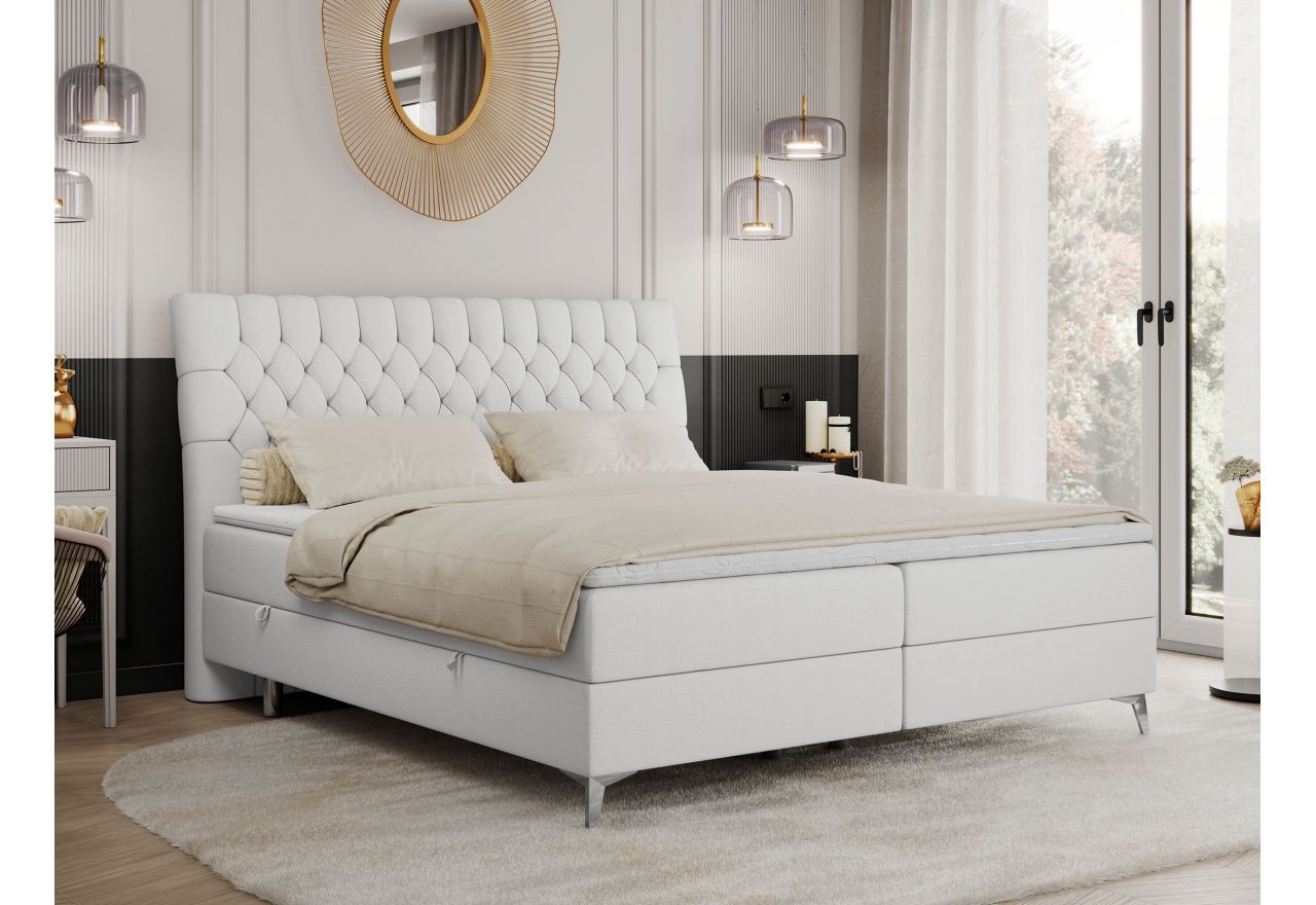 Główny materac kieszeniowy Multipocket dostarcza doskonałego wsparcia dla ciała, dzięki wysokoelastycznej piance T-30 co jest kluczowe dla zdrowego snu. Jego konstrukcja z niezależnymi kieszeniami minimalizuje przenoszenie ruchu. Dodatkowo, materac nawierzchniowy wykończony pianką T-25 zapewnia uczucie miękkości i komfortu, dostosowując się do kształtu ciała. Dwa pojemniki na pościel to praktyczne rozwiązanie, które pozwoli na łatwe przechowywanie pościeli i utrzymanie porządku. Automat na sprężynach sprawia, że otwieranie pojemników jest wygodne i szybkie. Tapicerowany zagłówek to prawdziwa ozdoba, która dodaje wnętrzu klasy i staje się centralnym punktem każdej sypialni.