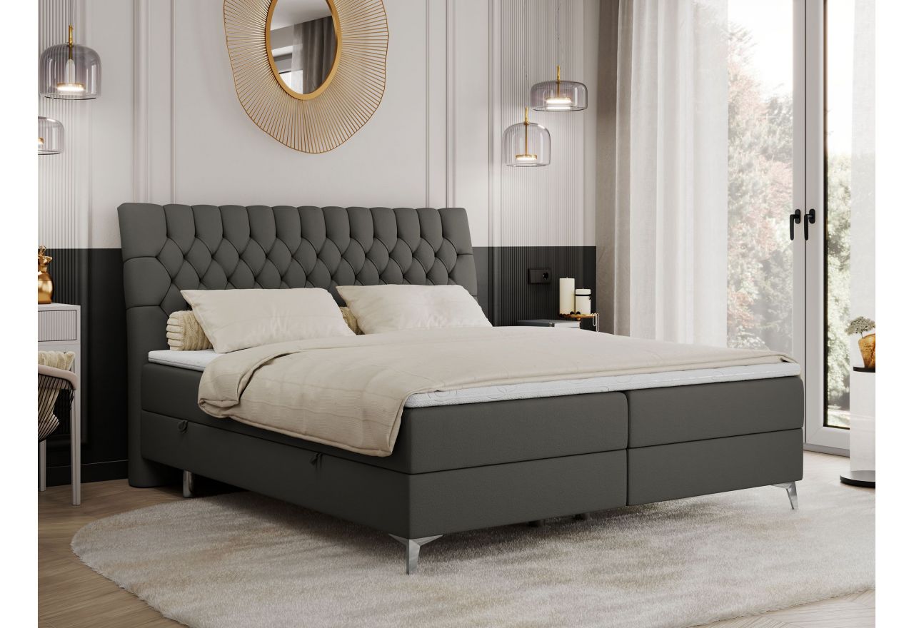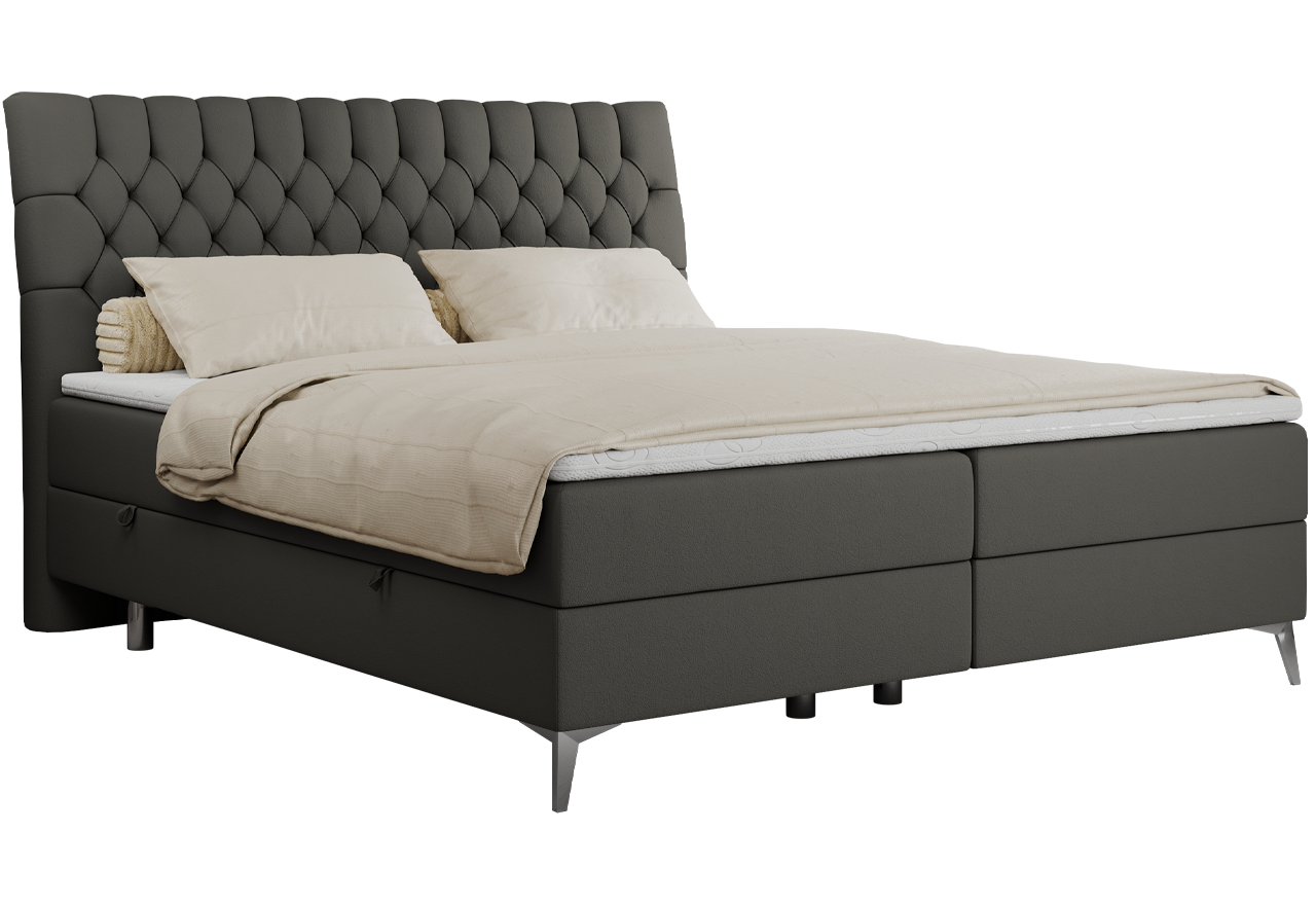 Główny materac kieszeniowy Multipocket dostarcza doskonałego wsparcia dla ciała, dzięki wysokoelastycznej piance T-30 co jest kluczowe dla zdrowego snu. Jego konstrukcja z niezależnymi kieszeniami minimalizuje przenoszenie ruchu. Dodatkowo, materac nawierzchniowy wykończony pianką T-25 zapewnia uczucie miękkości i komfortu, dostosowując się do kształtu ciała. Dwa pojemniki na pościel to praktyczne rozwiązanie, które pozwoli na łatwe przechowywanie pościeli i utrzymanie porządku. Automat na sprężynach sprawia, że otwieranie pojemników jest wygodne i szybkie. Tapicerowany zagłówek to prawdziwa ozdoba, która dodaje wnętrzu klasy i staje się centralnym punktem każdej sypialni.