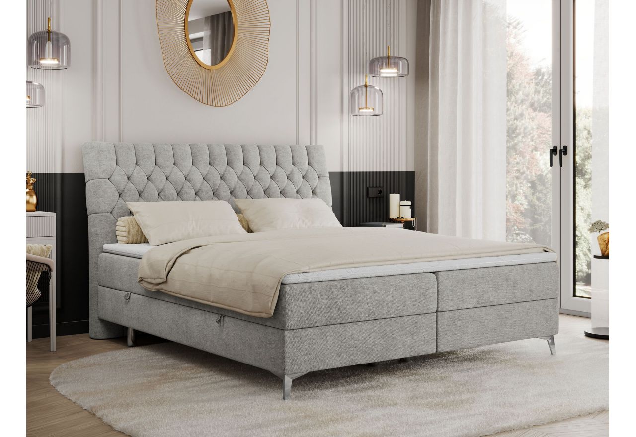 Główny materac kieszeniowy Multipocket dostarcza doskonałego wsparcia dla ciała, dzięki wysokoelastycznej piance T-30 co jest kluczowe dla zdrowego snu. Jego konstrukcja z niezależnymi kieszeniami minimalizuje przenoszenie ruchu. Dodatkowo, materac nawierzchniowy wykończony pianką T-25 zapewnia uczucie miękkości i komfortu, dostosowując się do kształtu ciała. Dwa pojemniki na pościel to praktyczne rozwiązanie, które pozwoli na łatwe przechowywanie pościeli i utrzymanie porządku. Automat na sprężynach sprawia, że otwieranie pojemników jest wygodne i szybkie. Tapicerowany zagłówek to prawdziwa ozdoba, która dodaje wnętrzu klasy i staje się centralnym punktem każdej sypialni.